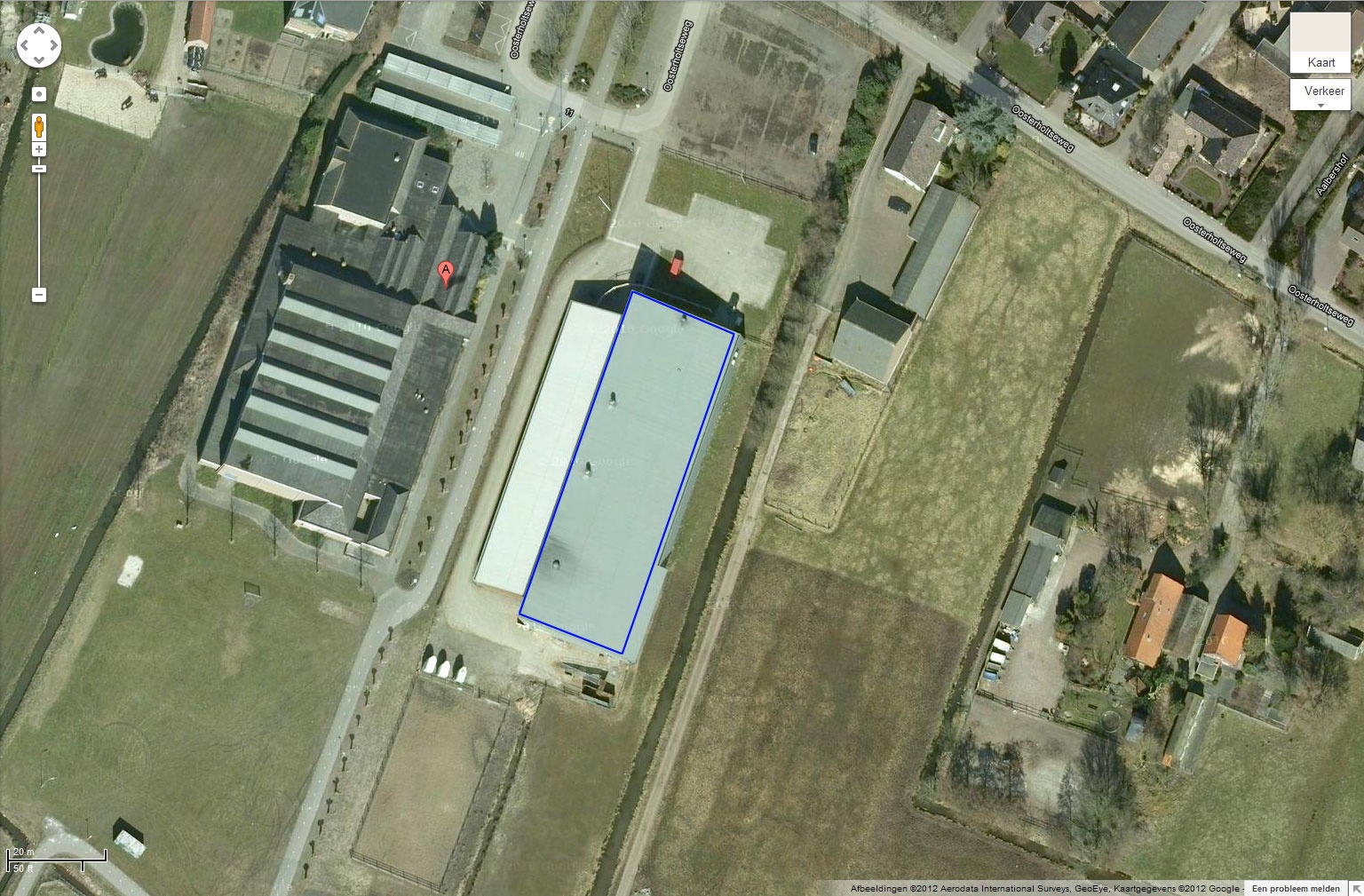 Het is ongeveer 25x70m, het plaatje is een screenshot van Google Maps. Dan is het zuiden onderaan toch? Laatst stond de zon tussen 12u en 3u toch eigenlijk wel recht op het blauw omlijnde gedeelte van het dak. Ik vroeg me af of je hier na verloop van tijd inkomsten uit kunt betrekken. Het is een manege voor gehandicapten en dus moet je blijven zoeken naar extra inkomsten om de sport te kunnen aanbieden tegen lage prijzen. Ik bedacht me dat het oppervlak van het dak wel erg groot is en je heel wat vierkante meters tot je beschikking hebt.