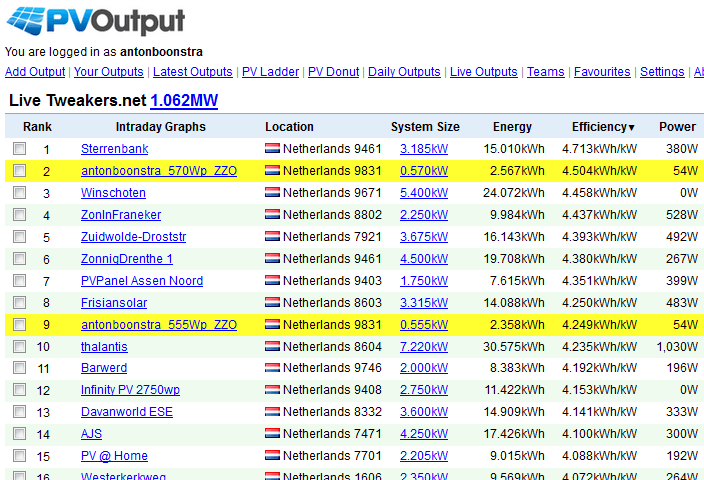 Ik mag hier niet klagen. Ik sta momenteel alweer op 1 en 4 in de Tweakers live output op pvoutput.org. Ik zit momenteel op 94% van de opbrengst t.o.v. de bizar goede augustusmaand van vorig jaar.