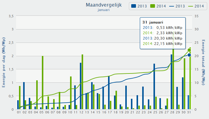 Januari lijkt inderdaad wel een slechtere maand te worden dan december 2013 terwijl ik op basis van statistieken over zonuren en opbrengsten van voorgaande jaren verwacht dat die beter zou zijn. Maar misschien dat de laatste paar dagen nog een inhaalslag doen.