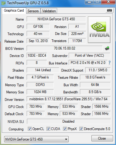 Nvidia Geforce GTS450 1GB (driver 295.51, ook getest met 275.33)