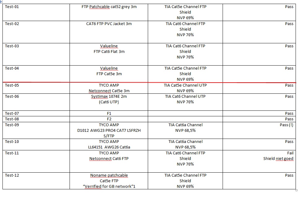 ook ik heb met bekabeling gewerkt AMP (cat7) die niet door de test heen kwam, omdat na onderzoek en metingen de bekabeling niet goed op volgorde in de bekabeling zat hierdoor onstaan er meetfouten