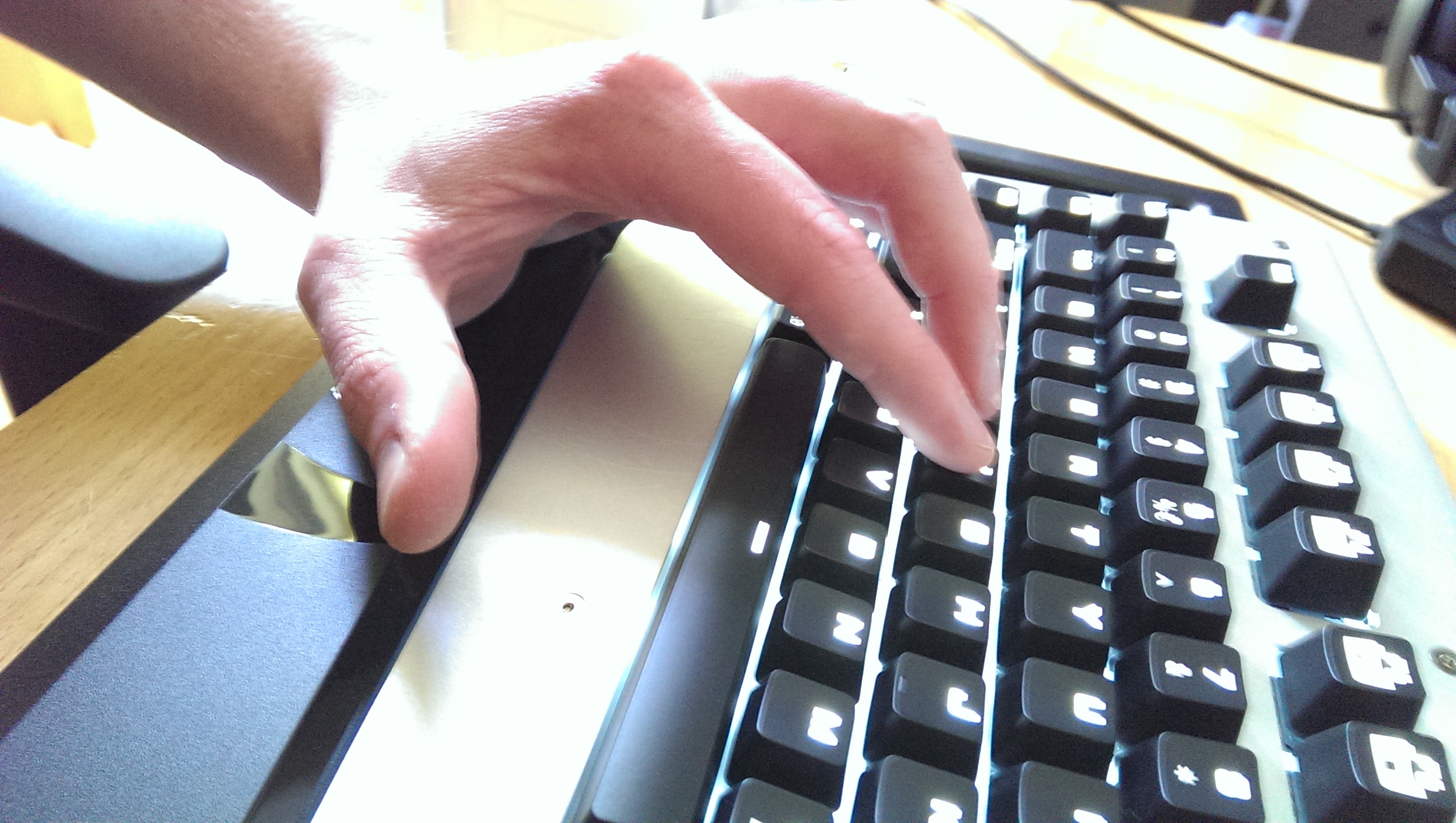 Ik raak de aluminium plaat in principe niet aan. het lijkt erop dat ze de vorm zo gekozen hebben dat het midden van je hand precies rond de kromming van het plastic deel valt als je je handen in de "tienvinger blind typen" houding houdt.