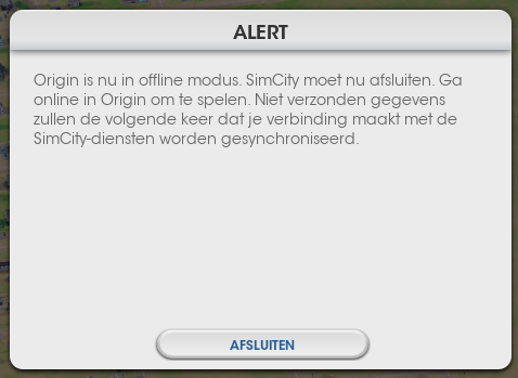 Maar een paar seconden later had ik dan weer verbinding en kon ik dan ook alles doen in Origin etc., maar de melding bleef en ik kon daardoor niets anders doen dan afsluiten. De stad bleef zich overigens inderdaad ontwikkelen op de achtergrond. De stad groeide, er kwamen zombies waardoor bijna 20.000 inwoners vertrokken / dood gingen etc. Maar goed, ik hoop dus dat dat beter is geregeld met het uiteindelijke spel en dat je gewoon verder kan spelen in single player modus.