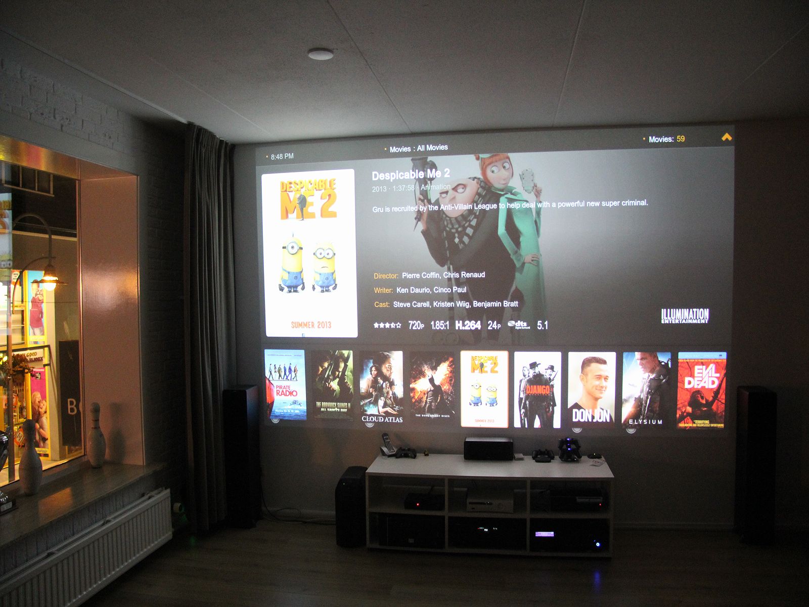 Wat staat er nu precies. Alles wordt aangestuurd middels een Denon AVR2113. Het geluid komt via de Jamo S608 (crossover op 90hz) en de bijhorende center en rear. Daarnaast wordt het lage ook nog een aangevuld door de Jamo Sub300.