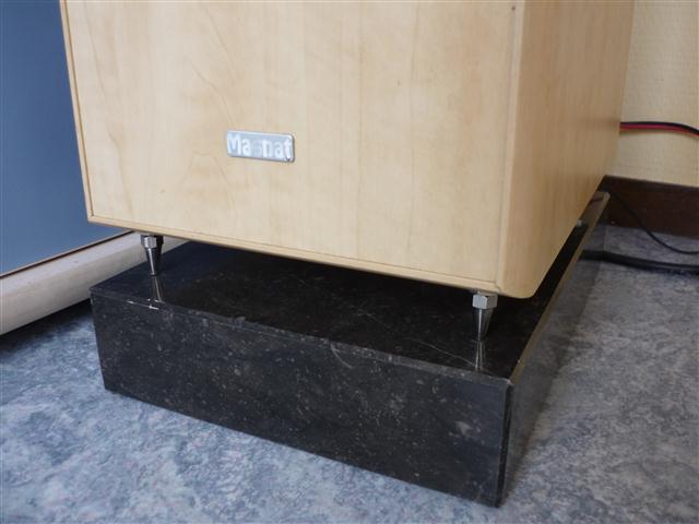 Ik heb zelf van Belgisch Hardsteen voeten laten maken, mooi opmaat van de speaker en lekker dik. Randen laten afschuinen en mooi glanzend laten maken. Speakers zelf hebben ook spikes eronder dus wel of niet dat het verschil maakt weet ik niet. Met de voeten merkte ik wel wat dat het geluid voller werd/bass zwaarder.