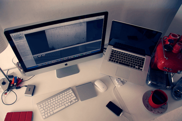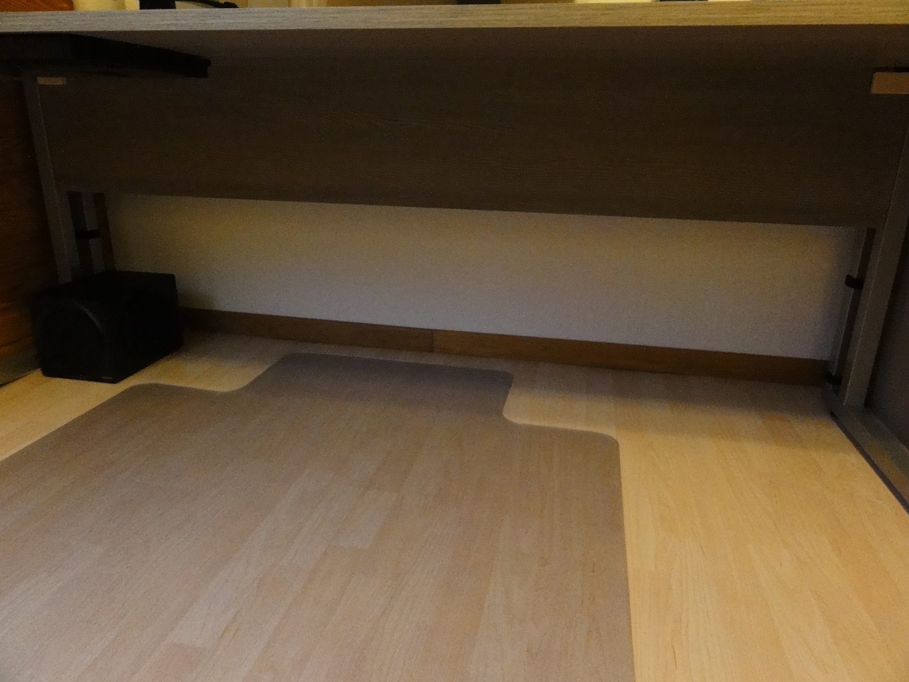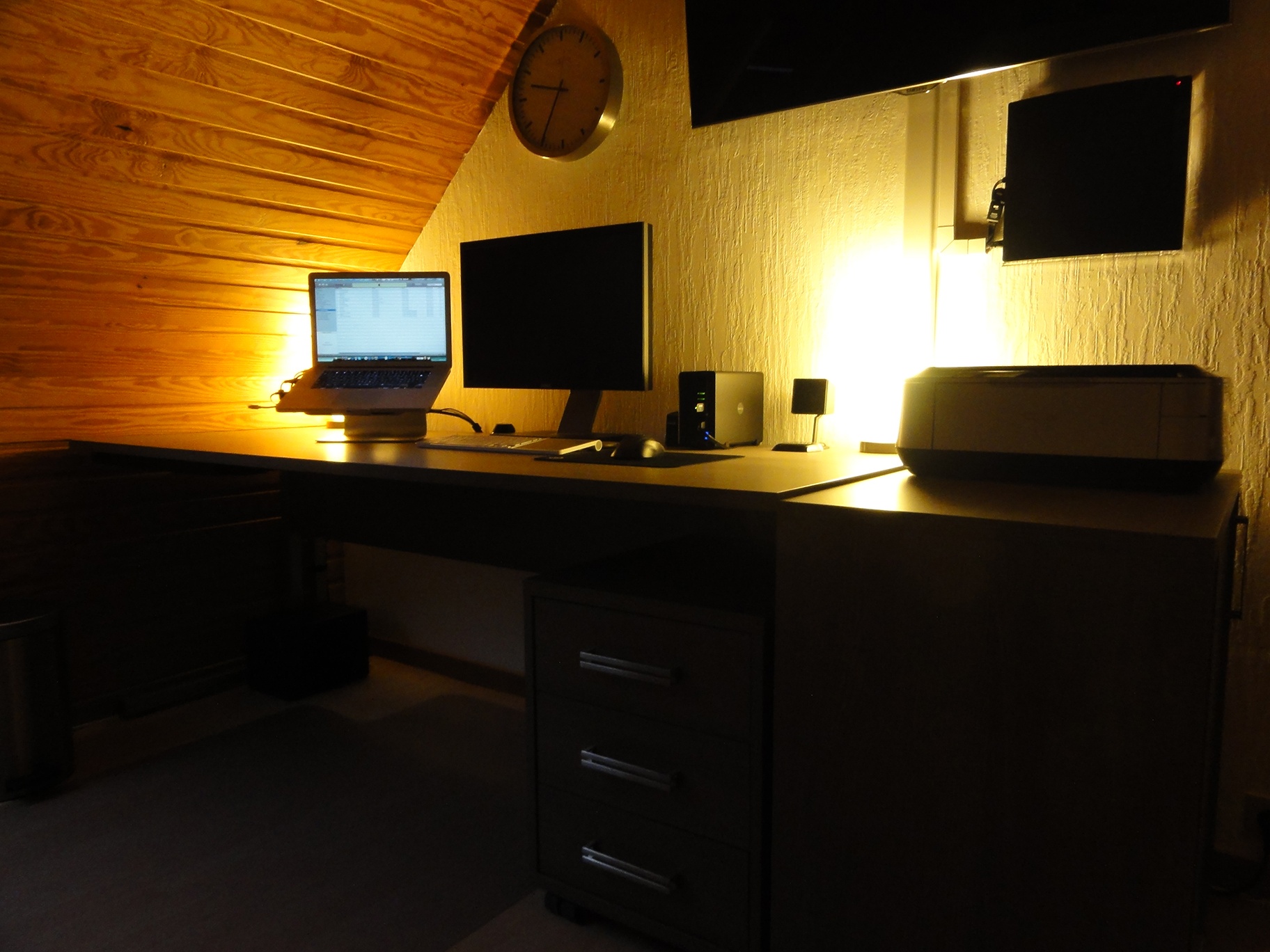 En de kabels van mijn MBA naar extern beeldscherm, geluid en wandcontact keurig weggewerkt met een kabelrol onder bureaublad geplakt, wat tie-rips en naar beneden met plakband langs de tafelpoot.