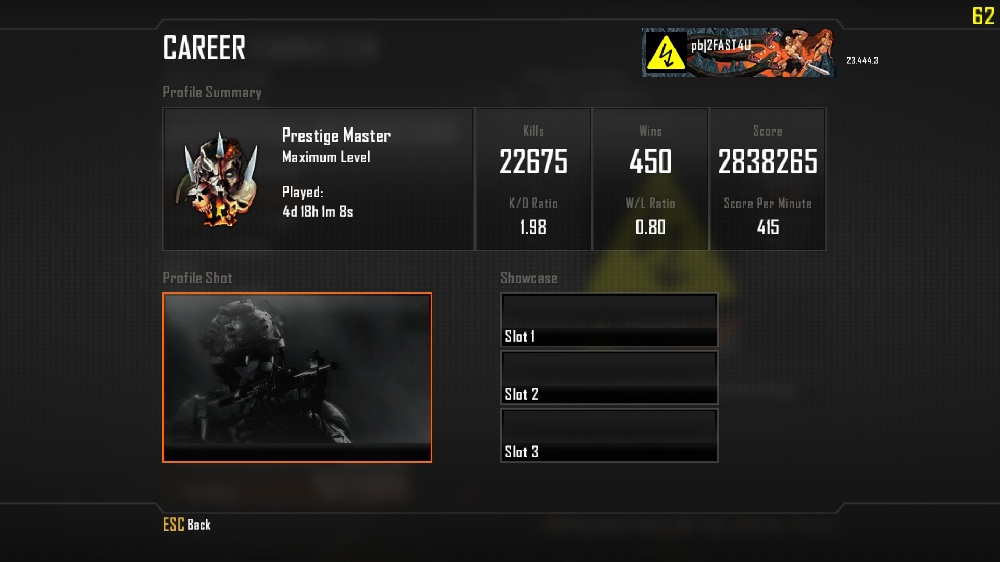 Gisteren mijn diamanten SMG's gehaald, eindelijk. Nu 6e prestige level 47. Op de xbox is het aantal host migrations echt niet meer leuk, elk potje minimaal 2 x en gemiddeld 1 op de 3 potjes kapt er helemaal mee door het gedashboard van sneue rukkers die met hun K/D bezig zijn....