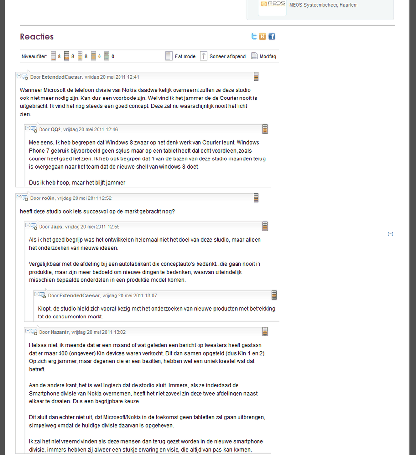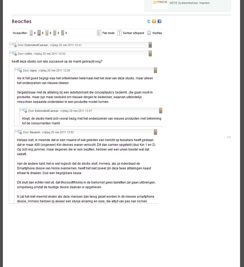 Aanvullend hierop lijkt het mij ook handiger om visueel duidelijker aan te geven wat oorspronkelijke reacties zijn en wat reacties op reacties zijn, nu word het alleen gedaan door de reacties iets te laten verspringen maar hierdoor is niet altijd in één oogopslag te zien of het gaat om een reactie op of een originele reactie.