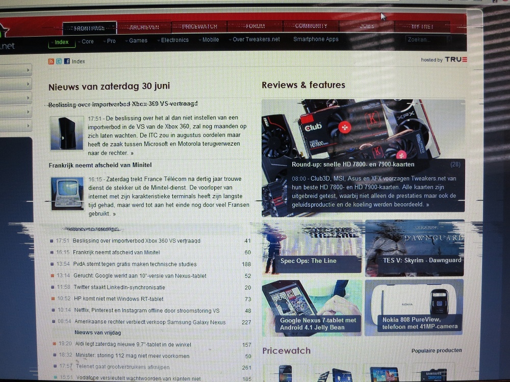 Het scherm van mijn (bijna) twee jaar oude HP DV7-4030ed (17 inch 1600x900 scherm) heeft opeens kuren. Er vormen zich allerlei horizontale lijnen in het scherm (zie foto, rond het midden). Daarnaast zijn de kleuren heel erg flets geworden.