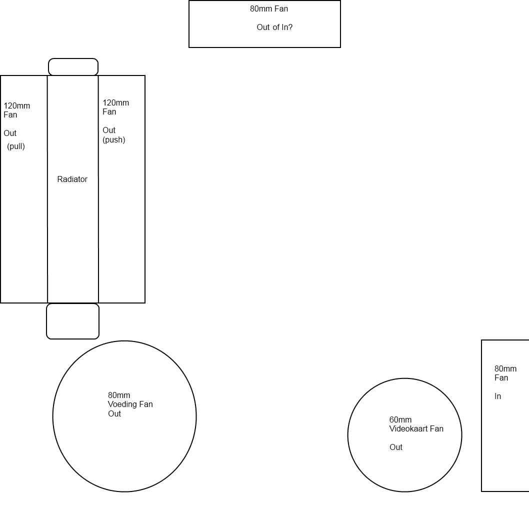 Wanneer ik de fans op de H60 radiator uit de kast laat blazen dan heb ik slechts 1 80mm fan welke lucht de kast intrekt, en waarschijnlijk behoorlijke onderdruk, is het in dat geval beter de bovenste fan welke nu ook als exhaust fan staat naar binnen te laten blazen, zodat deze lucht van buiten direct door de radiator getrokken wordt? Of is het wellicht beter de radiator fans als intake te plaatsen en de top fan als exhaust te laten?