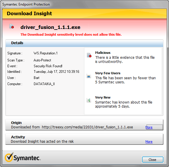 Inmiddels even naar gekeken en wat die waarschuwing precies inhoudt bij Symantec. Volgens Symantec is het een waarschuwing die gegeven wordt omdat: