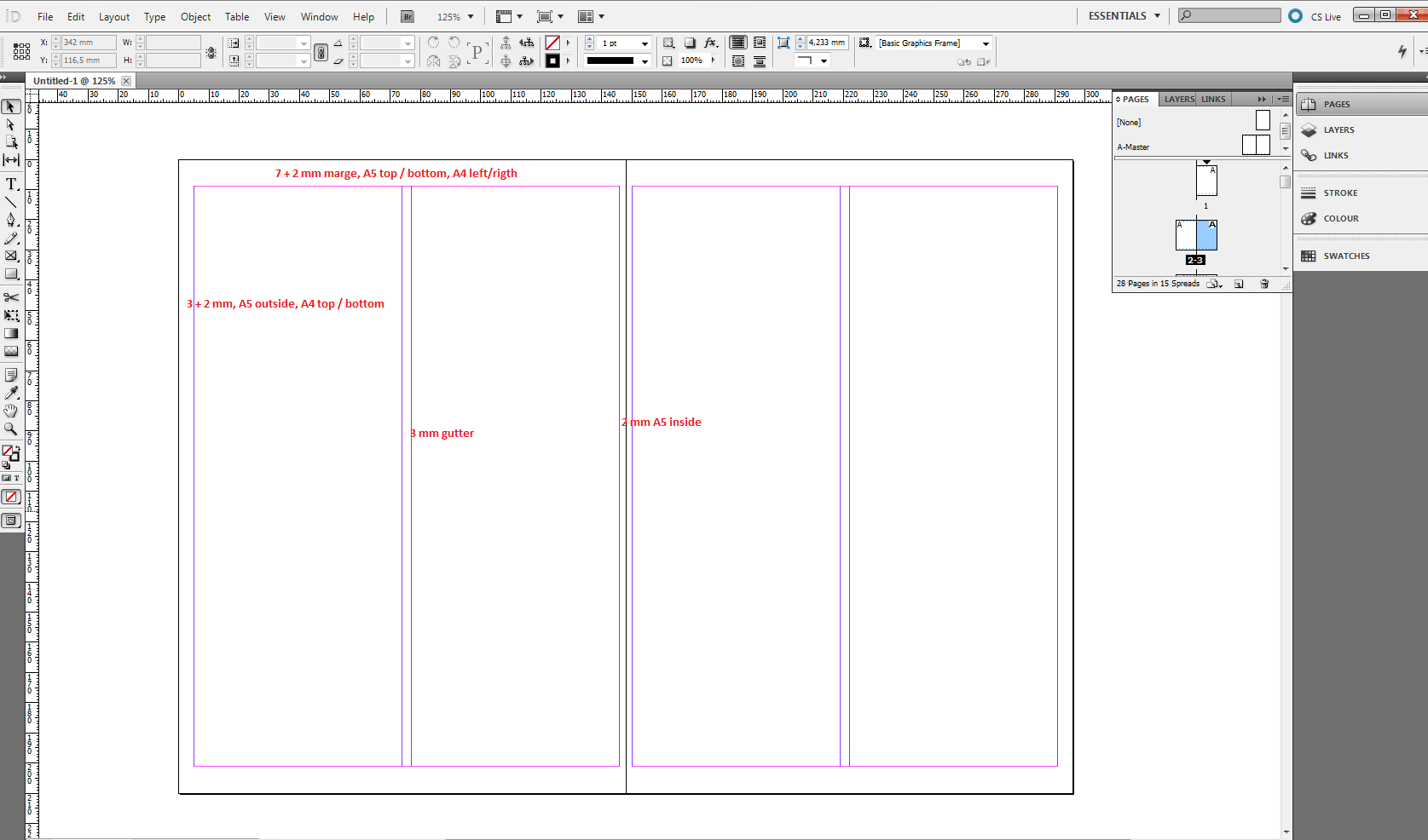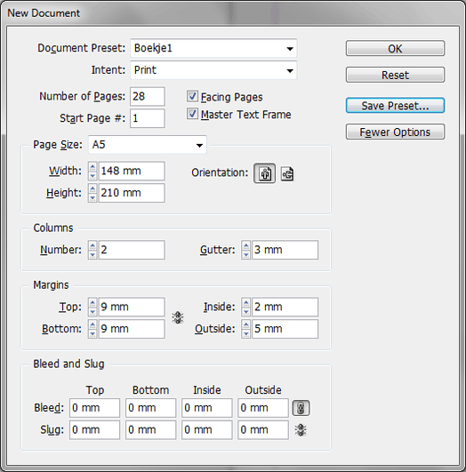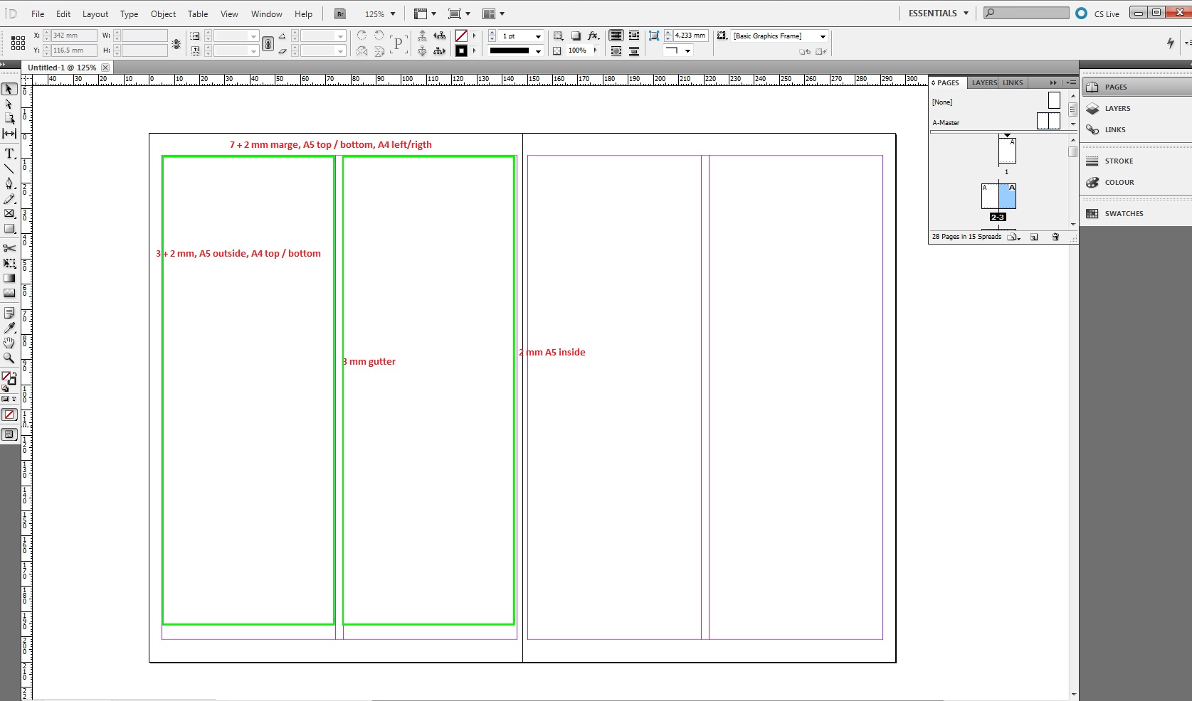 We willen graag een boekje maken. Hiervoor hebben we een A4 (liggend) waarop uiteindelijk 4 bladzijdes A5 (staand) komen, in totaal hebben we straks 28 bladzijdes A5, dus 7 vellen A4. In elke A5-bladzijde hebben we dan weer twee kolommen met een gutter van 3mm.