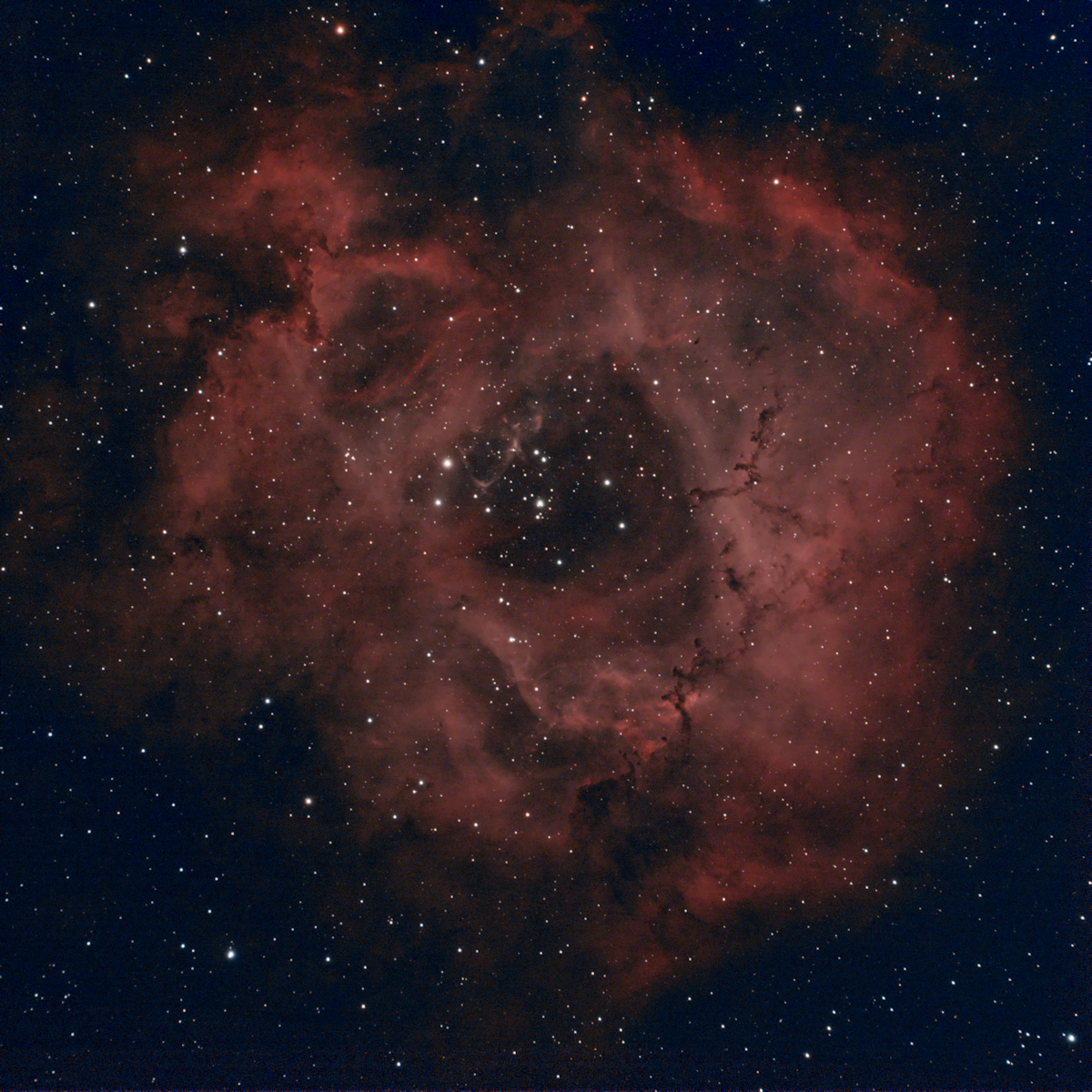Uiteindelijk heb ik in twee avonden voor ruim 2 uur aan bruikbare data weten te vangen van de Rosettenevel (NGC 2244, een nevel in sterrenbeeld Monoceros, de Eenhoorn), met een dualband filter (H-alpha - dus rood - en OIII - dus blauw). Totale belichting is 61 x 2 minuten = 121 minuten.