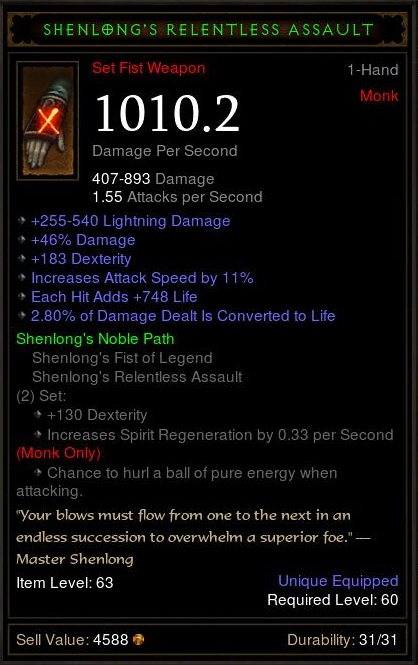 Top wapens op een monk zijn Won Khim Lau (vanwege de dmg bonus op lightning skills) en echoing fury. Wil je beiden met socket/chd en lifesteal ben je vrij duur uit. Begin als je kunt met de echoing fury, het liefst met socket. Neem dan lifesteal of loh op je offhand. Je damage zal hierdoor flink hoger worden.