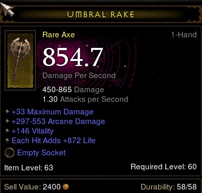 Veel vit, hoge LoH en socket voor crit damage/meer LoH. Ik denk dat de prijzen voor dit soort wapens op het moment bepaald worden door de populariteit van dual wielding barbs waar dit bijvoorbeeld een ideale offhand voor is.