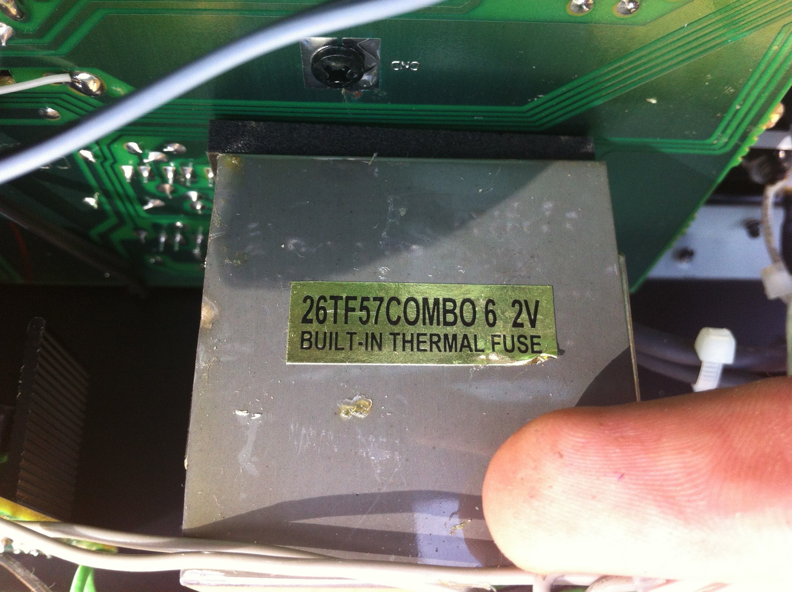 De secundaire wikkelingen van de transformator lijken in orde, maar de primaire wikkelingen kon ik geen weerstand van meten. Vandaar heb ik het vermoeden dat de ingebouwde 'thermal fuse' het begeven heeft.