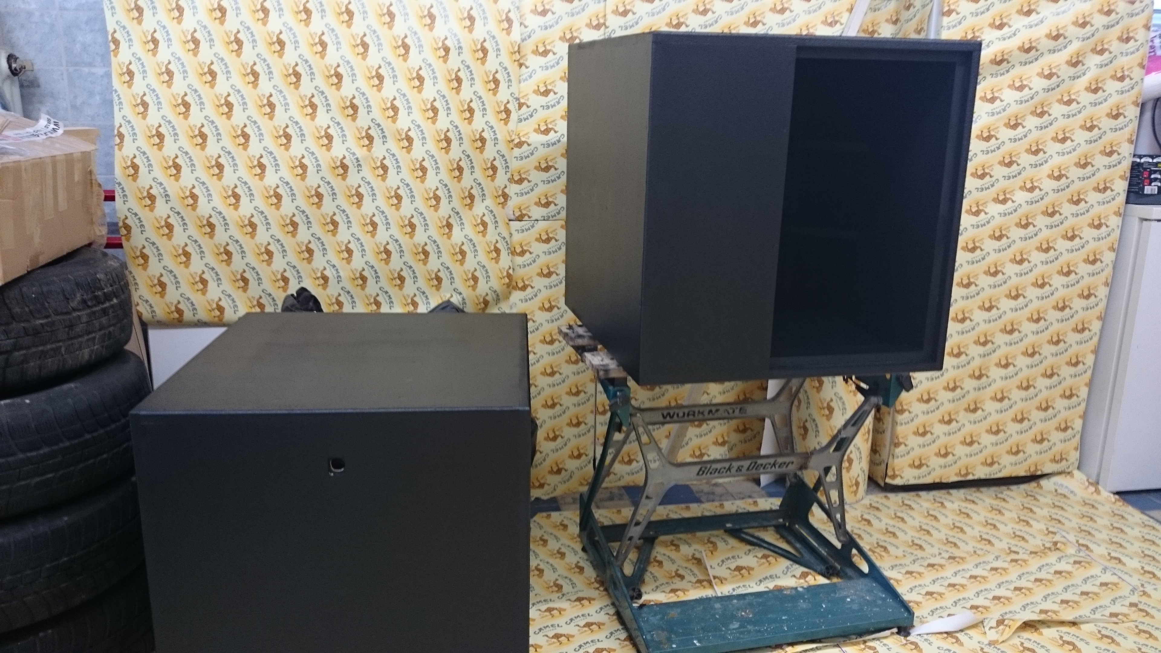 Ah shit, de grill. Vergeten. Wou een luidsprekerdoek tussen de twee baffles spannen. Nja, de woofers liggen redelijk diep in de behuizing, dat zal wel goed komen.