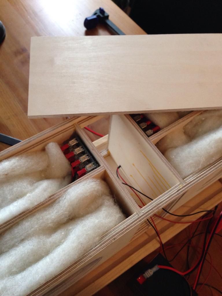 Ondertussen ben ik zelf ook verder gegaan met mijn tweede kistradio en die is bijna af. De eerste kistradio gaat vooral hard en is voor buiten prima. De tweede is bedoeld om een zo vlak mogelijk geluid te geven tot ongeveer 50Hz. Het resultaat is beter dan verwacht. Zie de foto's hieronder.
