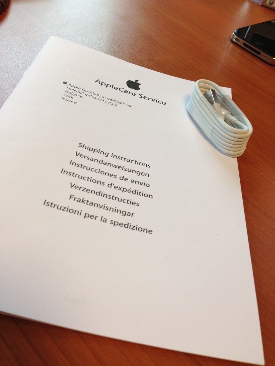 Vervolgens een uur met Apple aan de telefoon gehangen. Ze gaan binnen 2 werkdagen een nieuwe kabel opsturen (vreemd, aangezien levertijd in de online apple store 1-2 weken is) en ik moet mijn keyboard incl lightningkabel opsturen naar Apple. Dit doe ik natuurlijk pas wanneer ik de lightningkabel binnen heb.