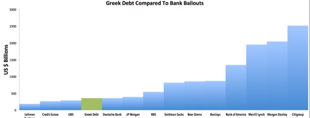 Wat er had moeten gebeuren als er in 2008 tot 2012 niet was ingegrepen in oa Griekenland. Griekenland zelf is het probleem niet. Deze banken hebben we laten ontsnappen, en dit plaatje illustreert waarom.