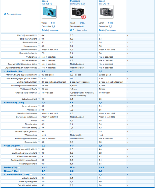 Bij de consumnetenbond stond de Ixus 125 op de 5e plek. Ik ben met name op zoek naar een camera die het bij weinig licht goed doet. Daar gaat het nu (Olympus u700 uit 2007) namelijk gegarandeerd mis. Probleem van deze camera is dat de sluitertijd omhoog gaat zodra je de flits uitzet. Dit kun je niet corrigeren. Zet je de flits niet uit dan wil het toestel vrijwel altijd flitsen, hij flitst zelfs weleens bij een blauwe hemel...