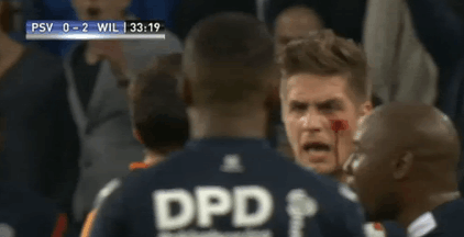 EDIT: Lens geeft de effectiefst elleboog van het jaar. Geen kaart, en een flinke hoofdwond voor de tegenstander. Kan weer trots op zichzelf zijn.