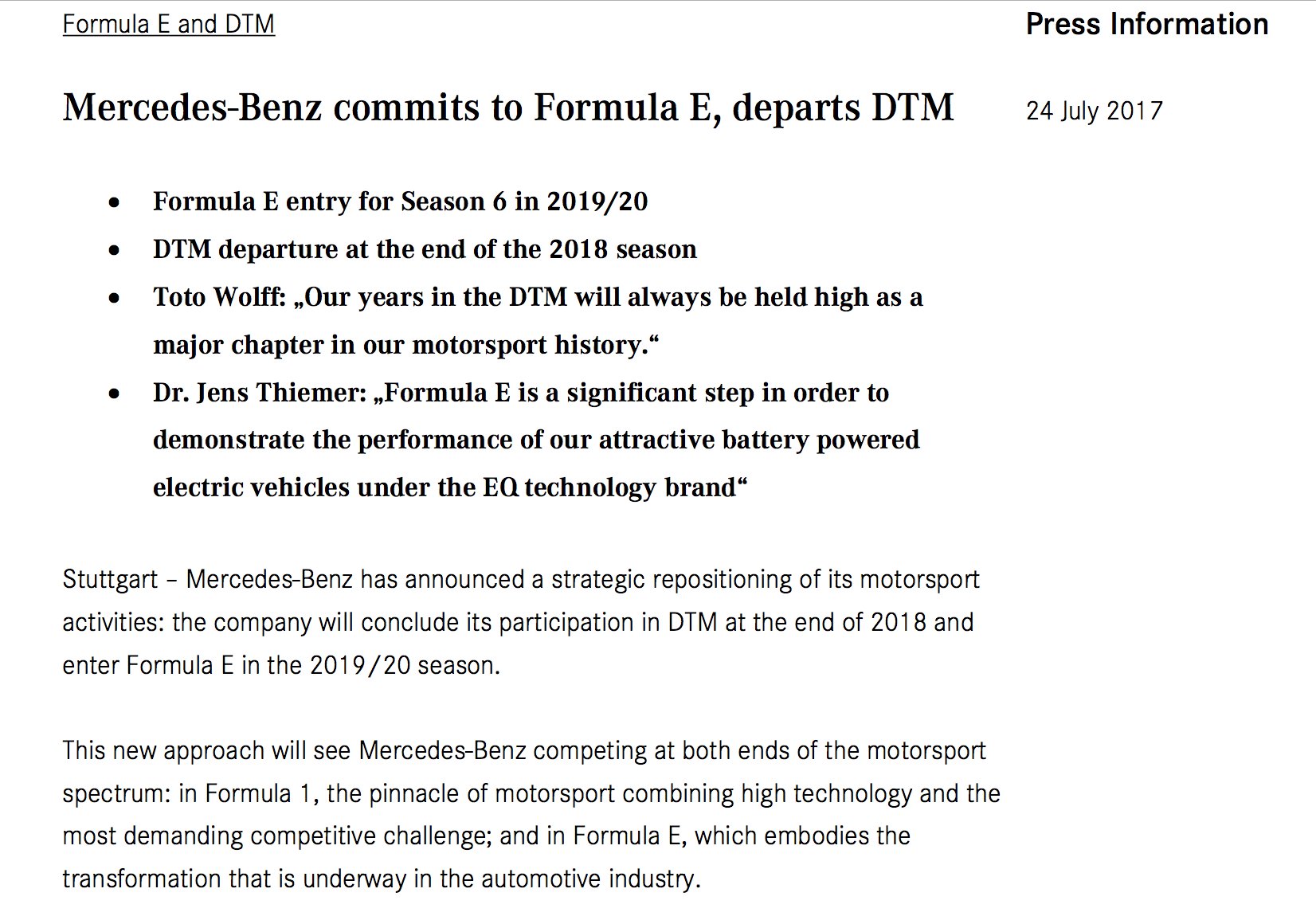 Serieus Race nieuws: Mercedes gaat na 2018 de DTM verlaten en zich richten op FE 2019/2020