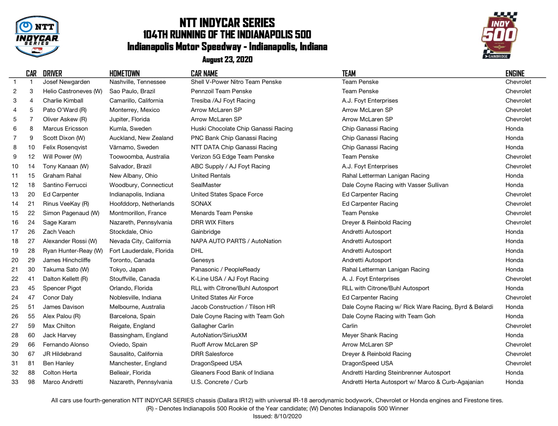 Castroneves (2), Davison (25), Alonso(29), Hildebrand (30) en Hanley(31) zijn volgens mij de coureurs die speciaal instappen voor de Indy 500. De rest heeft al 1 of meerdere races in het seizoen al meegedaan.Verder ken ik het normale veld niet helemaal. Wie zijn de outsiders? (aangeven met een cijfer is ook prima)