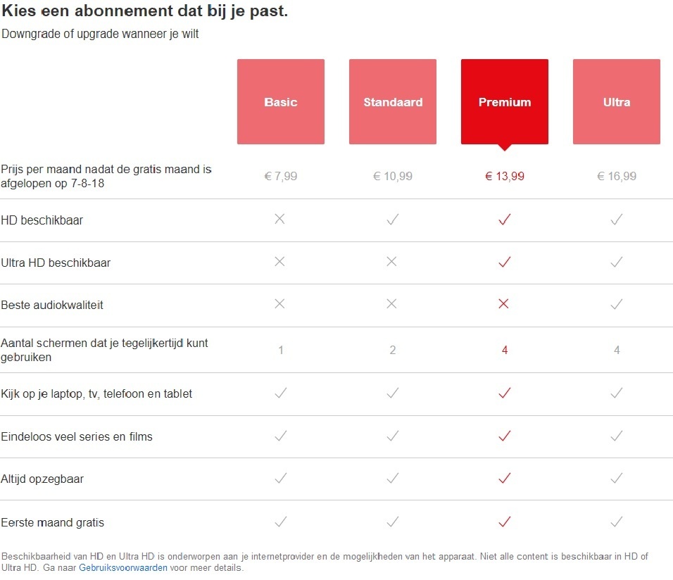 Mochten deze gewijzigde/nieuwe abonnementen worden ingevoerd, dan is dat natuurlijk een slimme zet van Netflix tegen het delen van een abonnement. In de jaren dat ik nu Netflix heb is het abonnement al behoorlijk duurder geworden (ik heb Netflix vanaf de start in NL) en zou dan nu ook nog verder worden beperkt. Nu is het delen van een abonnement natuurlijk eigenlijk niet de bedoeling, maar als je binnen één huishouden met 2 personen iets verschillends wilt kijken moet je een duurder abonnement gaan nemen en met 3 of meer zelfs het allerduurste. Ultra HD en HDR boeit mij verder niet. Het beeld is goed genoeg op mijn 50” Full HD plasma scherm.
