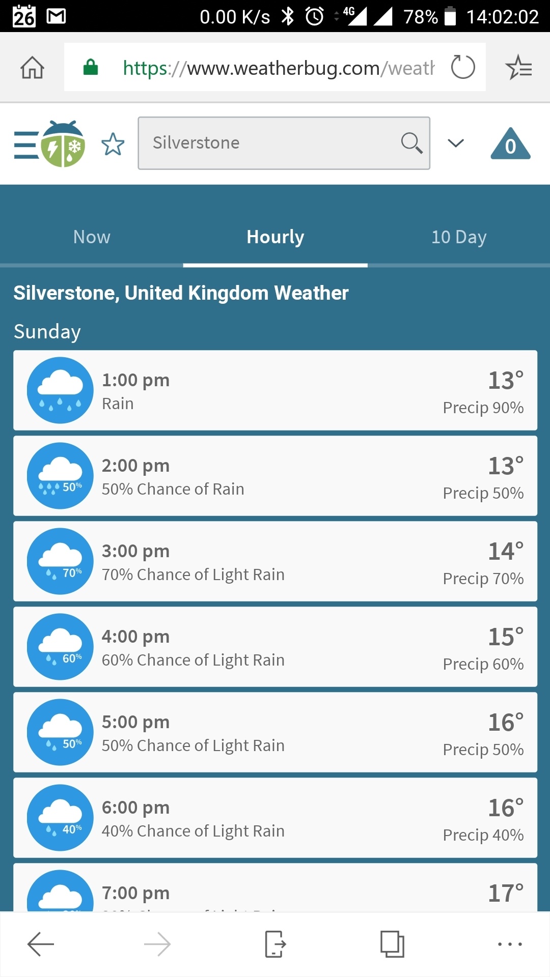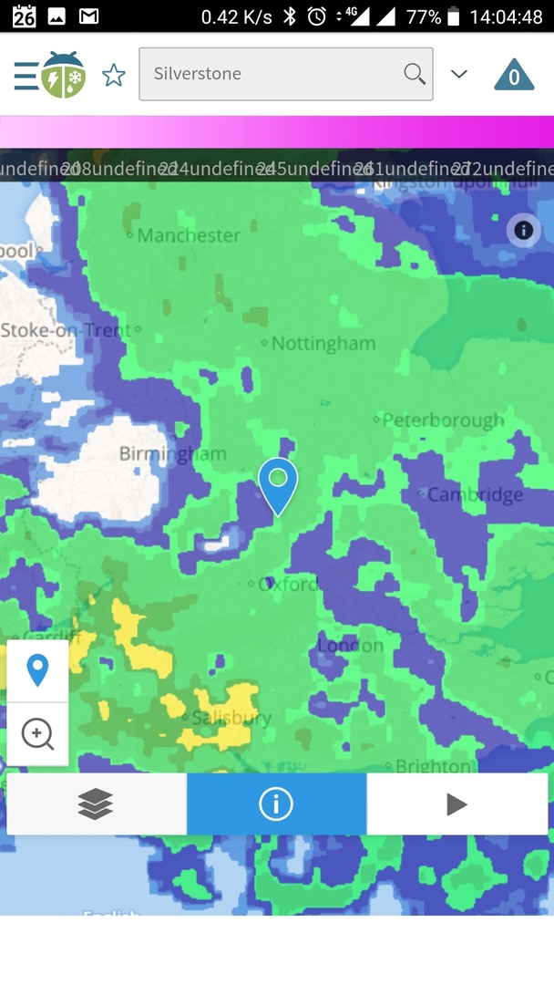 Net even de buienradar bekeken voor Silverstone; pas rond 15:30 (Engelse tijd) lijkt er ruimte in de wolken te komen. Dan zijn we hier in NL al klaar met de F1, waarschijnlijk.