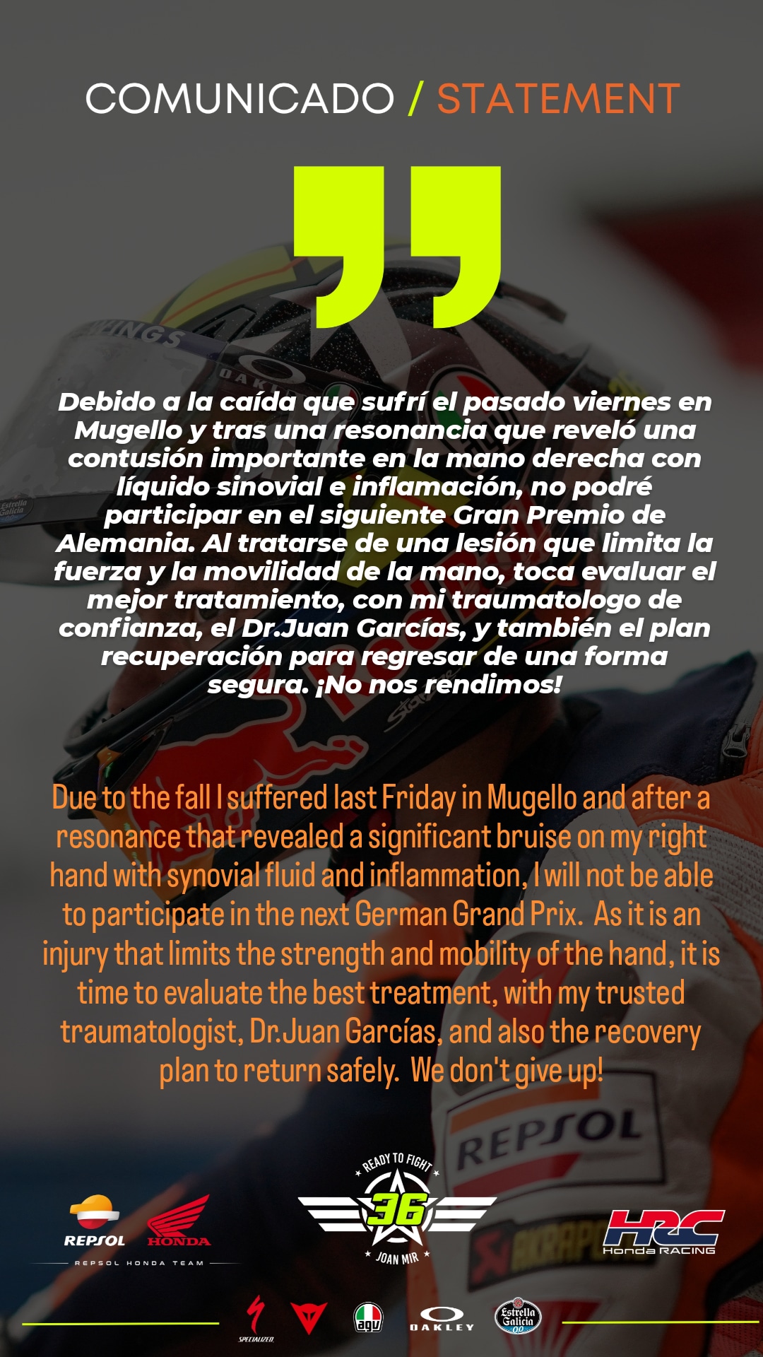 “Unfortunately in this sport, accidents can happen. When there is an incident, and you’re wrong, there needs to be a consequence. But we need consistency. We ask for consistency. Look at crashes [like Taka’s or Alex’s with me, there were big hits last year. But because it’s Marquez, everybody wants to put the knife in."