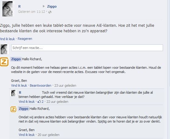 Dat zegt hij ook helemaal niet. Ziggo is/was vreemd bezig om de klagende bestaande klanten wél te voorzien van dergelijke actieproducten en anderen niet. Trek dan, zoals gezegd, één lijn; bestaande klanten niet en nieuwe klanten wel. Dreigen met opzeggen? Dan ga je maar weg. Dat Ziggo nu besloten heeft om bestaande klanten tegemoet te komen op voorwaarde dat ze twee jaar klant blijven is prima.sphere schreef op woensdag 12 juni 2013 @ 23:13: