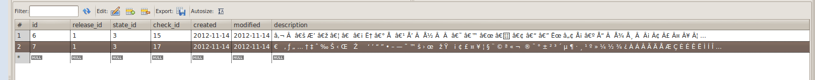 Ik wilde als test zowel uit de Java-tool als vanaf de PHP-website een hele zwik non-ascii karakters naar de database sturen: