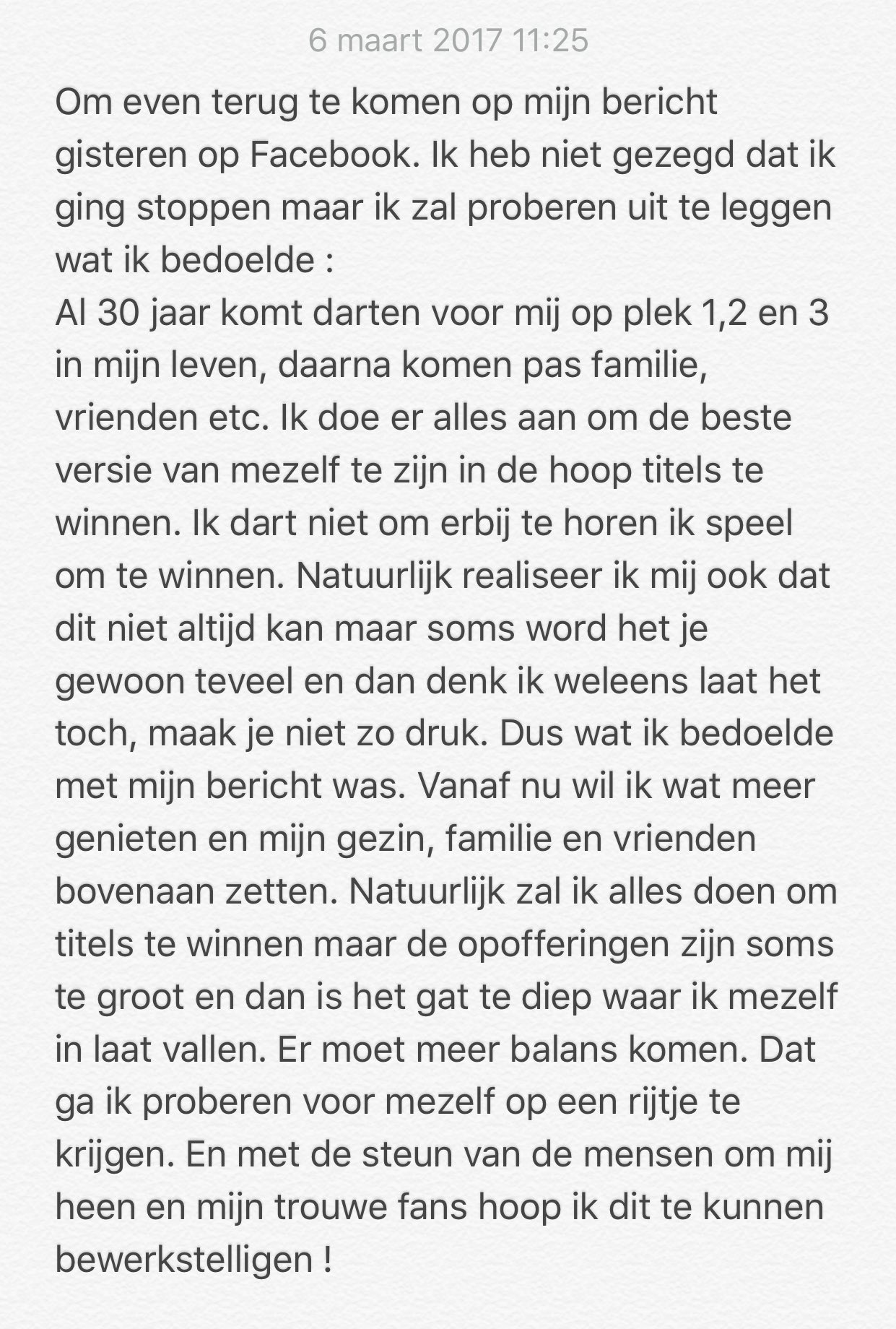 Als hij ondermaats gooit dan kun je denken "ik kan het niveau niet meer aan " en heeft het dan nog wel zin allemaal (en hij gaat echt nog wel jaren door, de man verdient een vermogen met pijlen/reclame/boekingen e,d,).