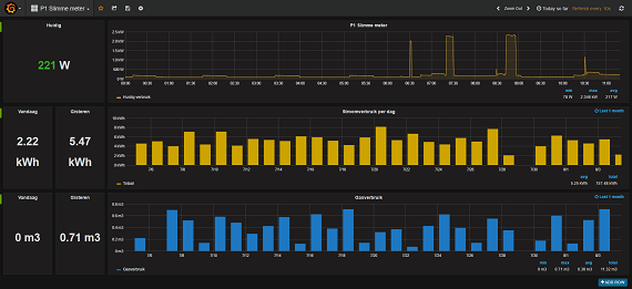 Domoticz heeft niet bepaald mooie grafieken, de leesbaarheid (en daarmee de bruikbaarheid) laat m.i. sterk te wensen over. Ik lees de slimme meter uit met een Python-script wat de data in een InfluxDB-database opslaat. Vervolgens maak ik met Grafana grafiekjes van die data.