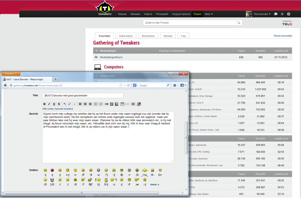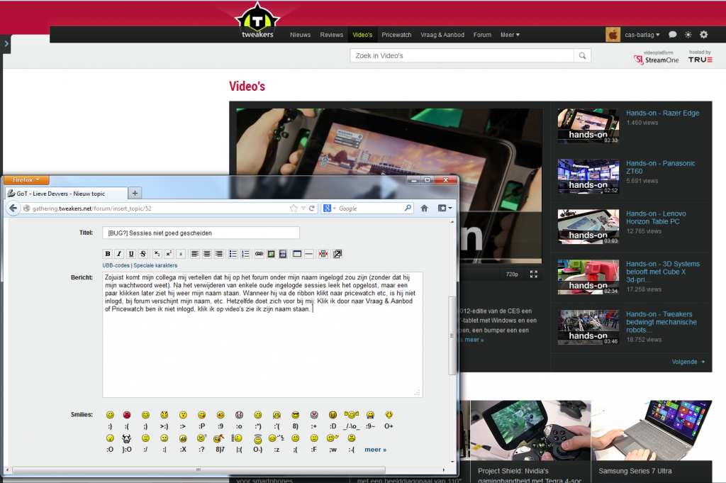 Zojuist vertelt mijn collega mij dat hij op het forum onder mijn naam ingelogd zou zijn (zonder dat hij mijn wachtwoord weet). Na het verwijderen van enkele oude ingelogde sessies leek het opgelost, maar een paar klikken later ziet hij weer mijn naam staan. Wanneer hij via de ribbon klikt naar pricewatch etc, is hij niet inlogd, bij Video verschijnt mijn naam, etc. Hetzelfde doet zich voor bij mij: Klik ik door naar Vraag & Aanbod of Pricewatch ben ik niet inlogd, klik ik op Video's zie ik zijn naam staan.