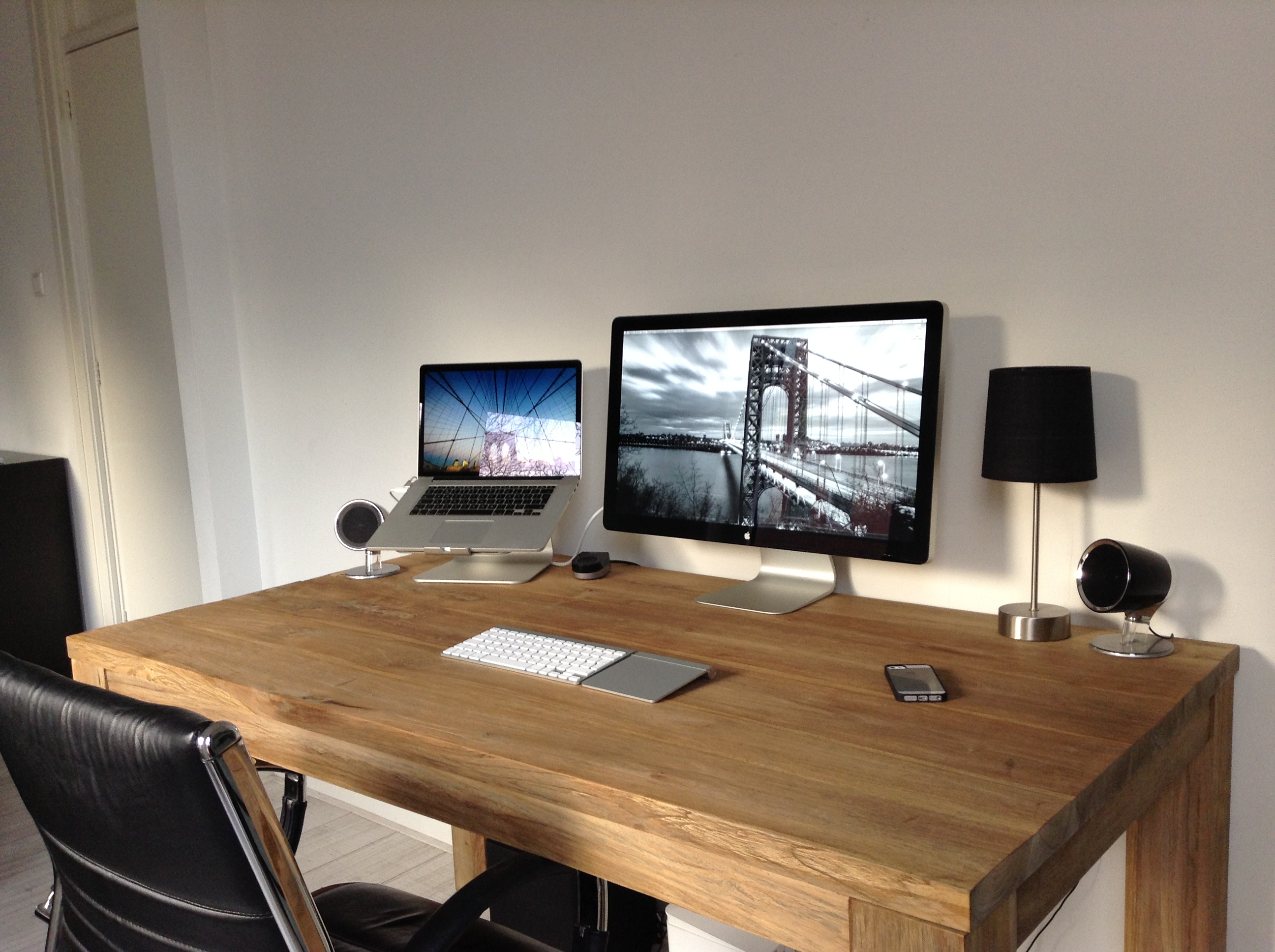 Een Dell U2711 , een setje Logitech speakers (geen idee welk model) een setje LED verlichting van de Ikea, een USB 3.0 behuizing voor de 500GB HD die eigenlijk in mijn MacBook zat en een iPhone 5 op rustend op een Sena Ultraslim.