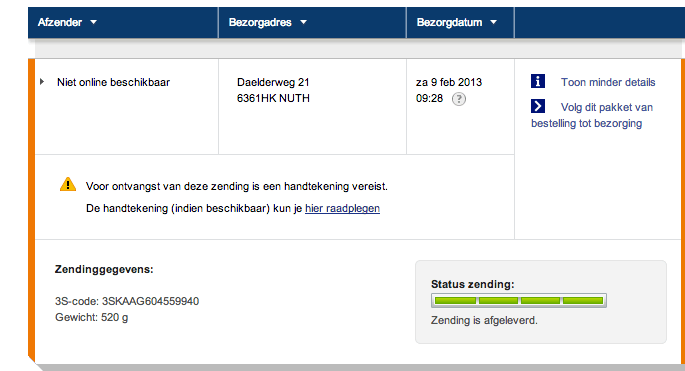Telefoon is Vrijdag middag opgestuurd (aangetekend) via PostNL. Zaterdag ochtend om 09:38 is hij afgeleverd bij Dynafix (ik kan de handtekening en naam van diegene die getekend heeft zien).