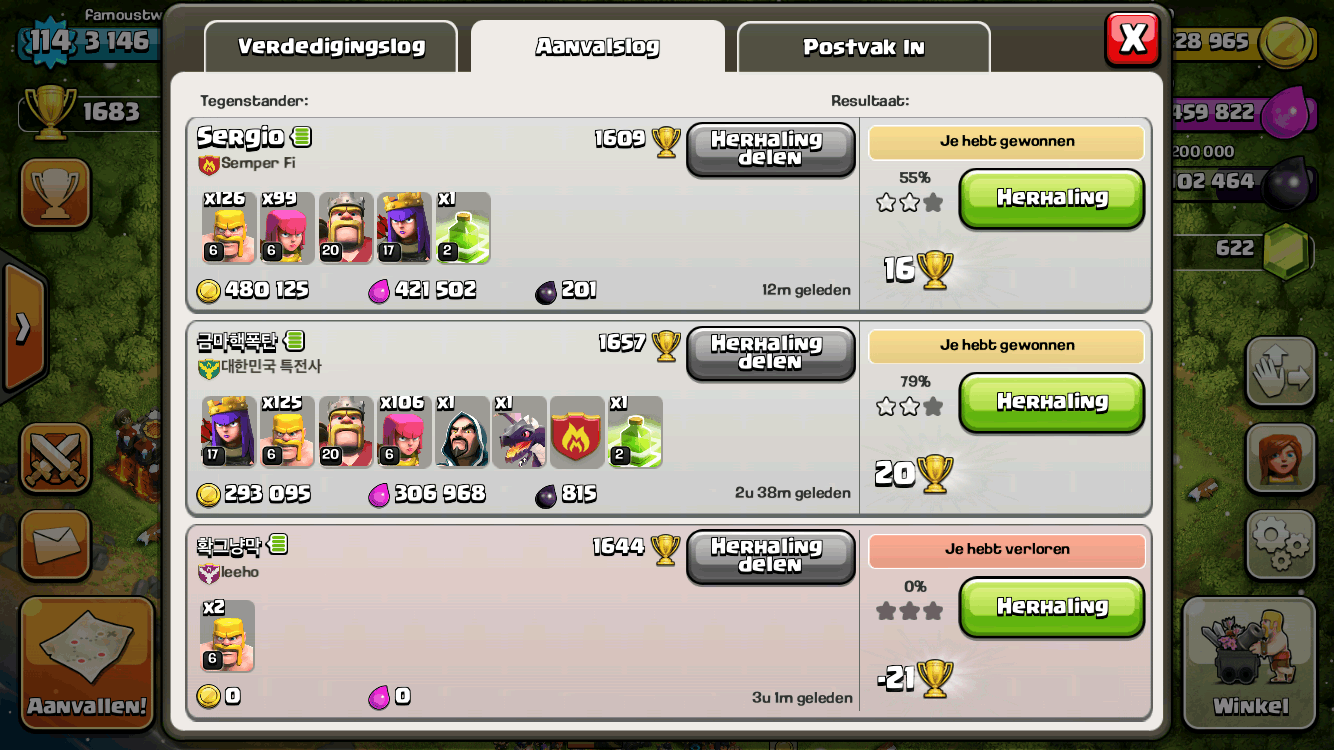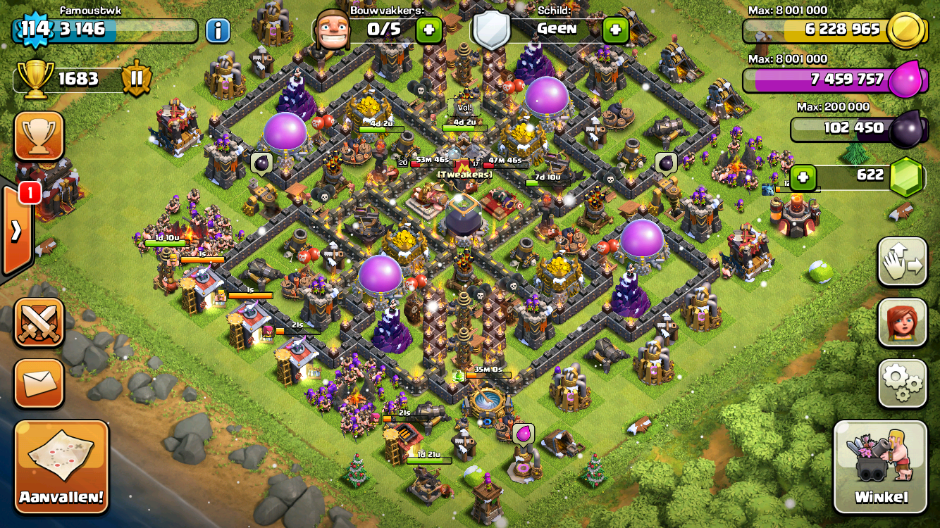 Bij de start van de boost ging het hier geweldig, de laatste twee dagen heb ik gewoon nauwelijks meer aangevallen omdat ik meer wegklik dan binnenhaal. En het lijkt wel elke dag slechter te worden. Gelukkig heb ik nu wel bijna mijn muren allemaal op lvl 8 en een deel in de kern op 9. Prima dus en King (naar 17) en Queen (naar 16) allebei in de upgrade.