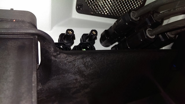 En hieronder even een foto, zoals het nu aangesloten is. De 2 (4) aansluitingen aan de zijkant zijn gebruikt, dit is goed zo, niet dat alles op 1 MPP-tracker zit? (Ik wil dit even controleren bij jullie, want ik had niet het idee dat de installateurs heel veel ervaring met deze omvormers hadden. De panelen liggen overigens wel heel netjes!)