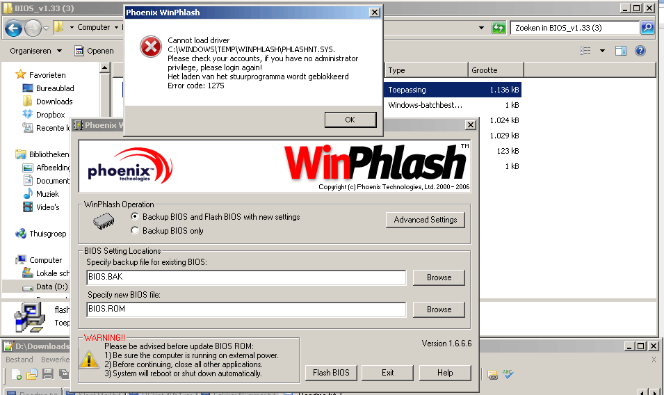 Oplossing: Download Hirens Boot CD, brand, start er vanaf op, kies voor Mini Windows XP (bootable XP vanaf CD) en voer dan de bios update uit. Dan werkt het prima.
