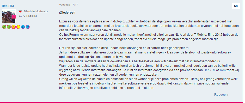 Reactie van T-mobile n.a.v. het accu probleem. Het wordt gezien als een hardware probleem....