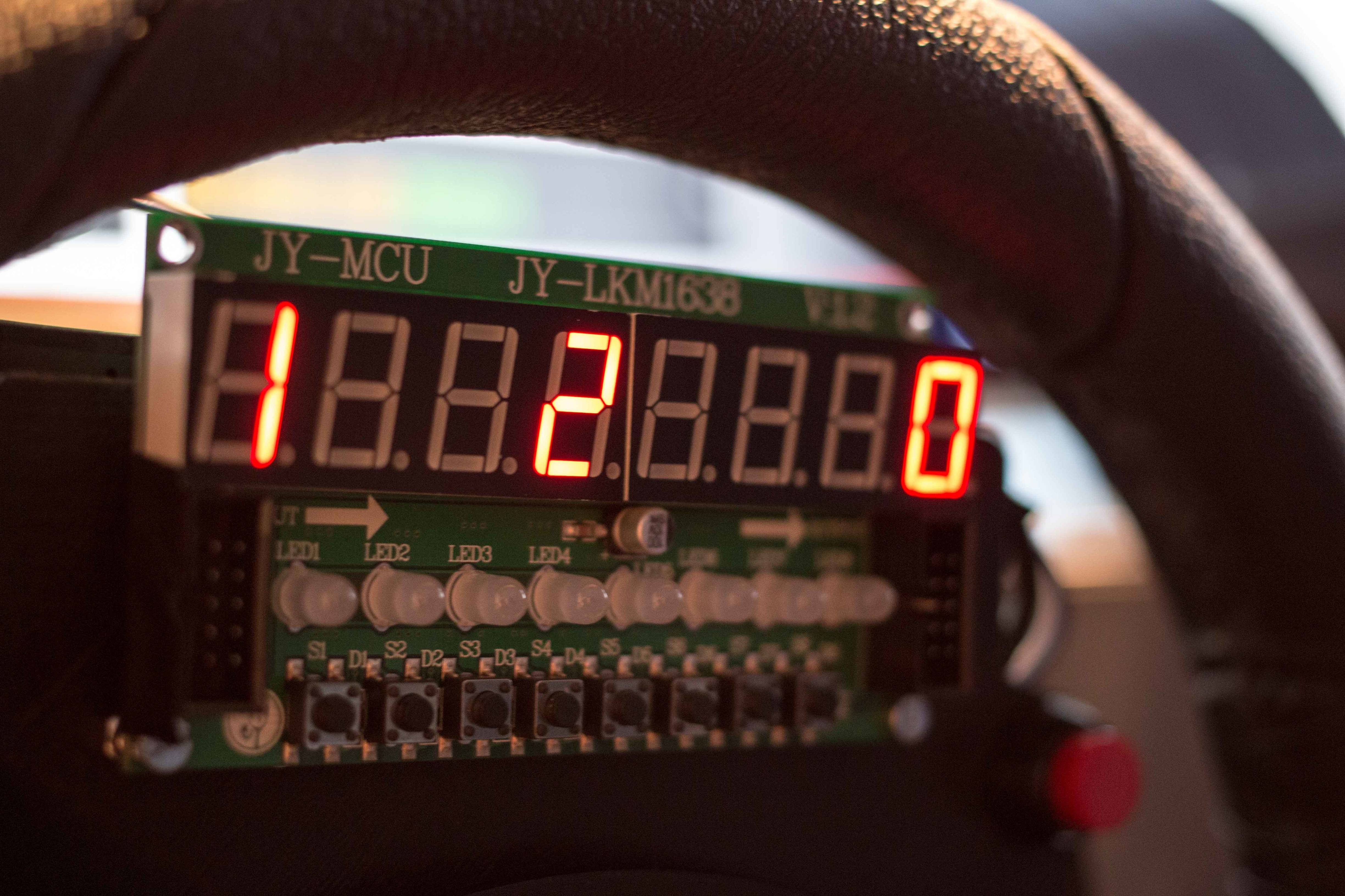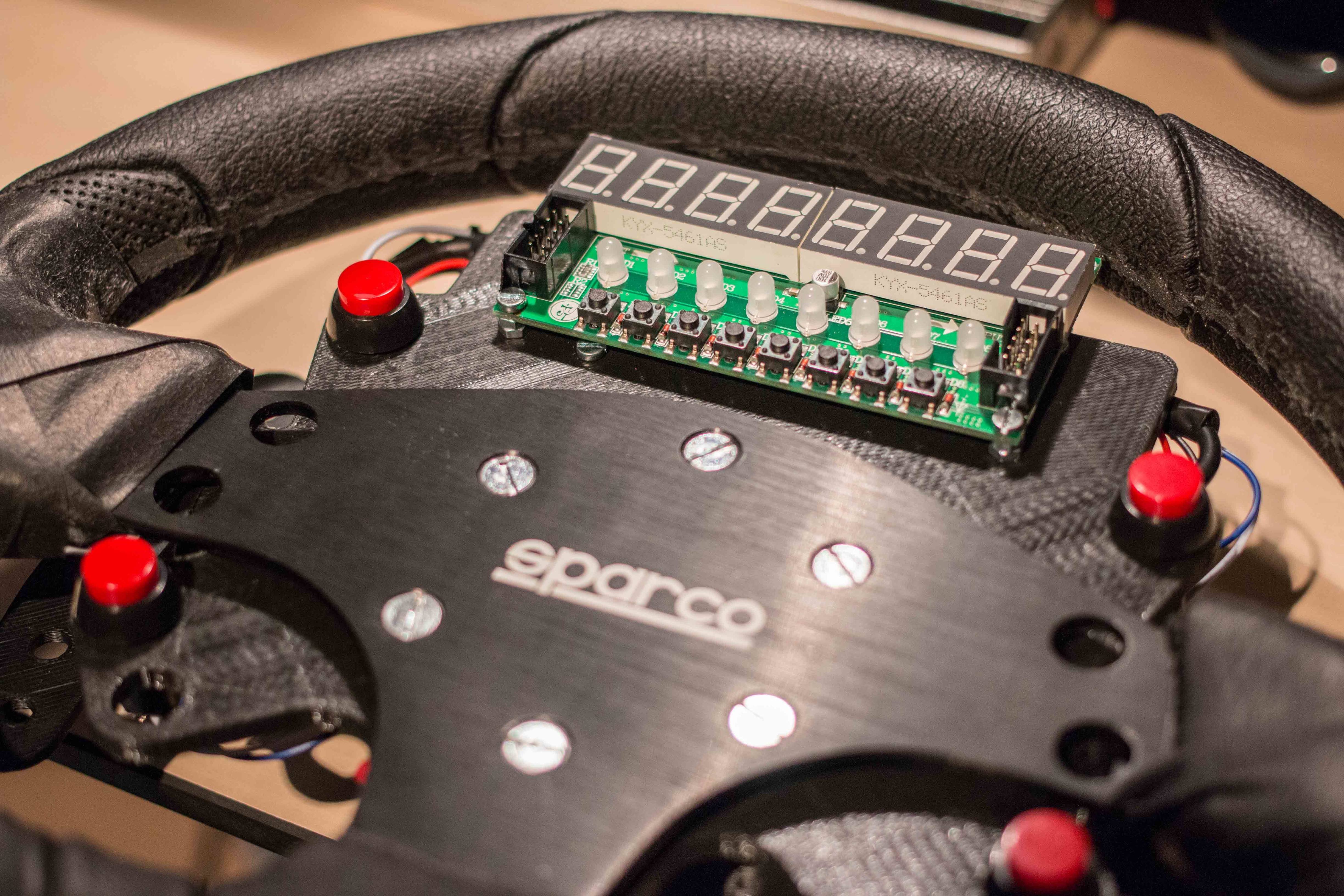 Doe-het-zelf stuurwiel, was origineel voor OSW base bedoeld, maar voor nu even met Thrustmaster T300 base. Inclusief knoppen, schakelflippers en LCD scherm aangestuurd door SimHub.