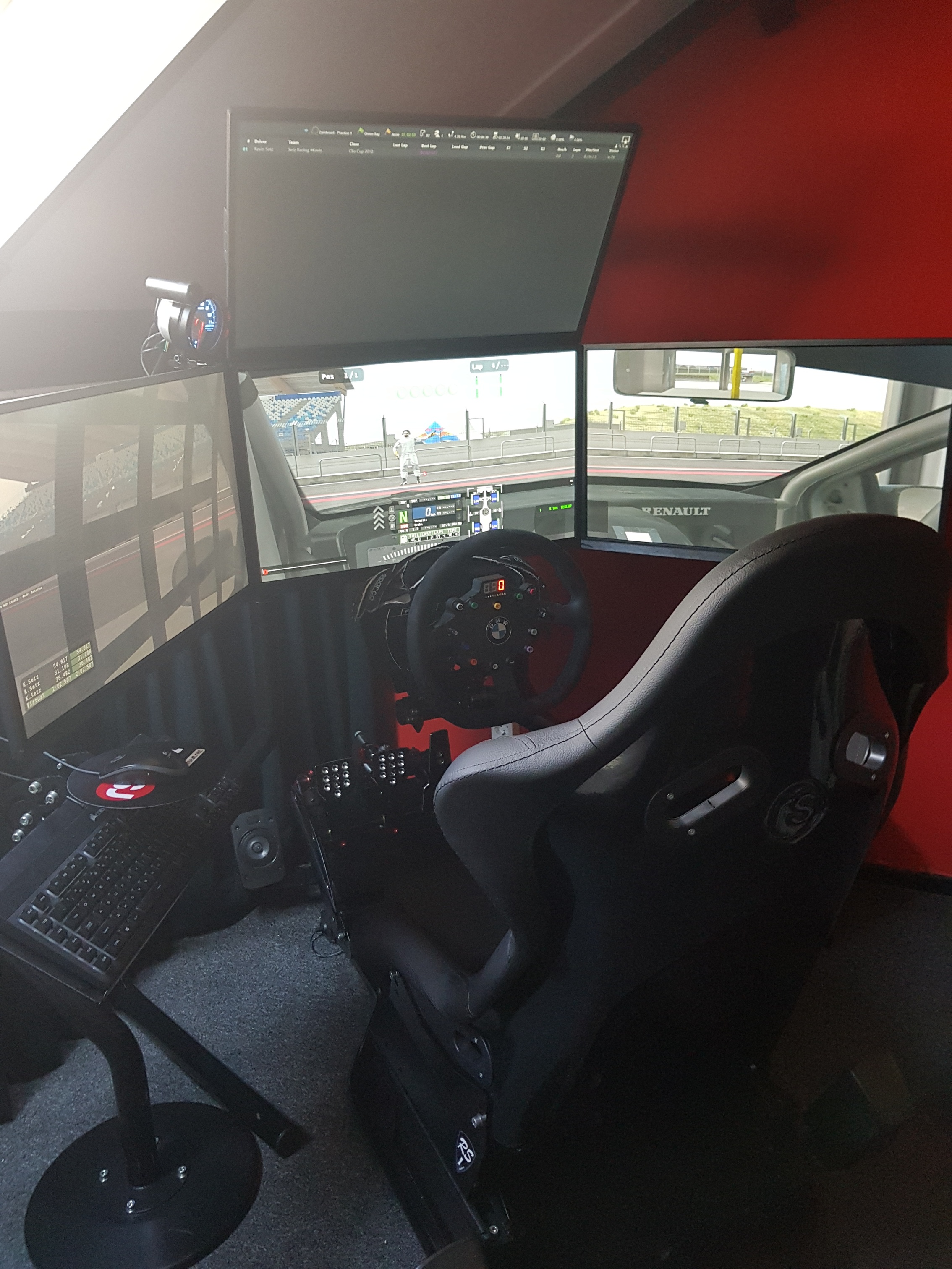 Bodnar stuur, Heusinkveld pedalen, PC'tje en drie beamers. Maar vooral de circuits, en de autodata die gebruikt wordt zorgt voor het grootste verschil. Deels komt dat doordat hij meeloopt in bèta's en ontwikkelteams, deels doordat de engineers ook bij hem trainen met de coureur en dus echte data ter beschikking stellen.