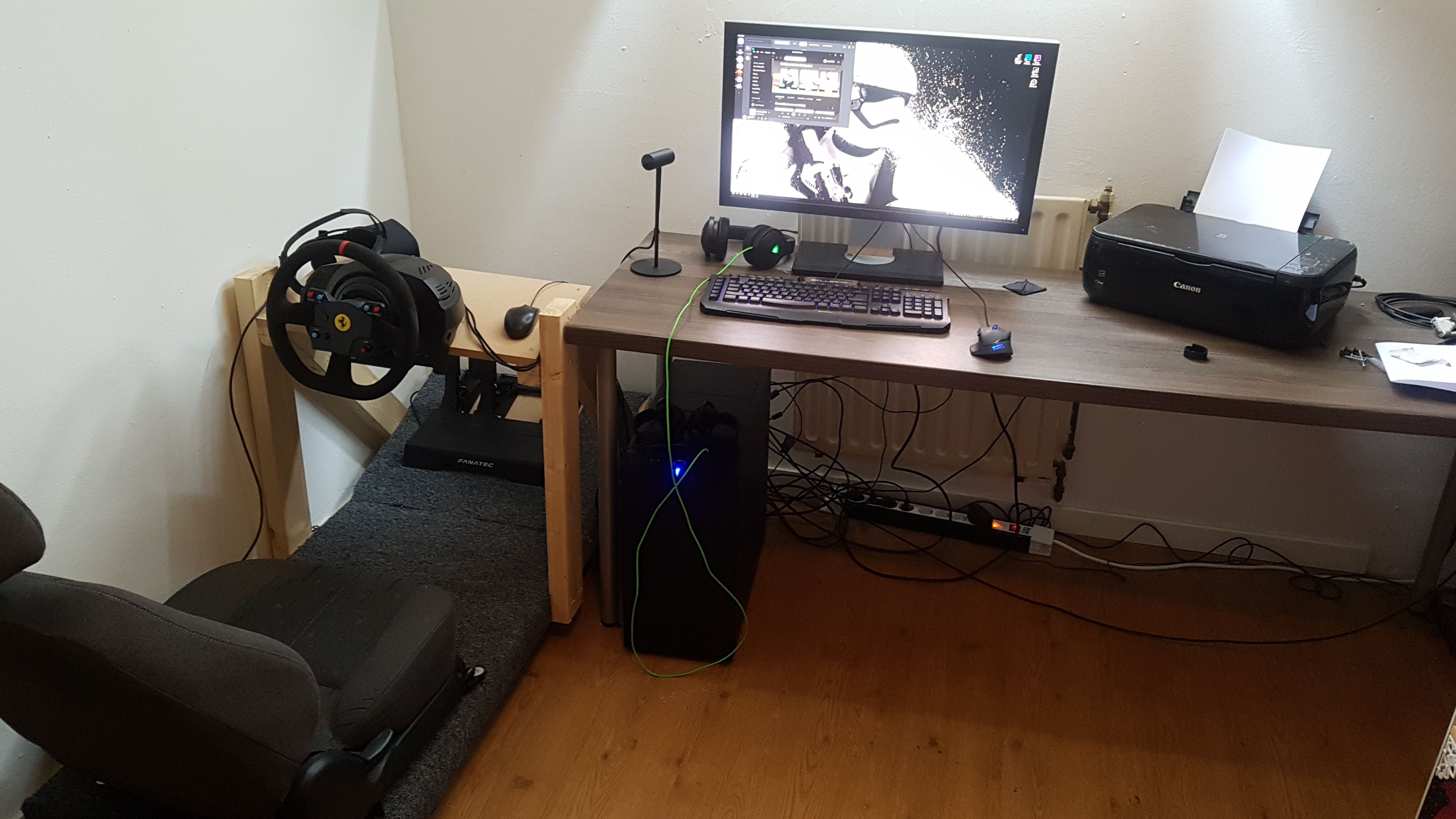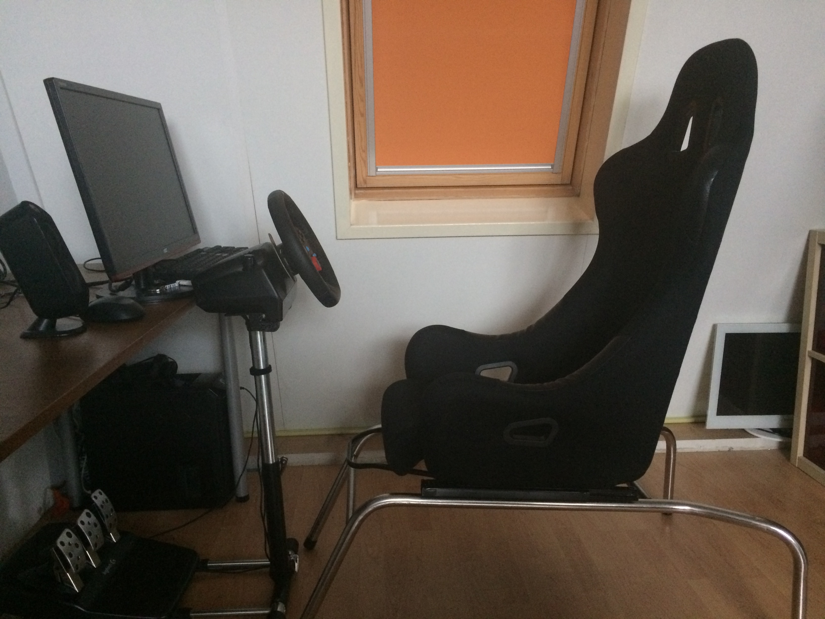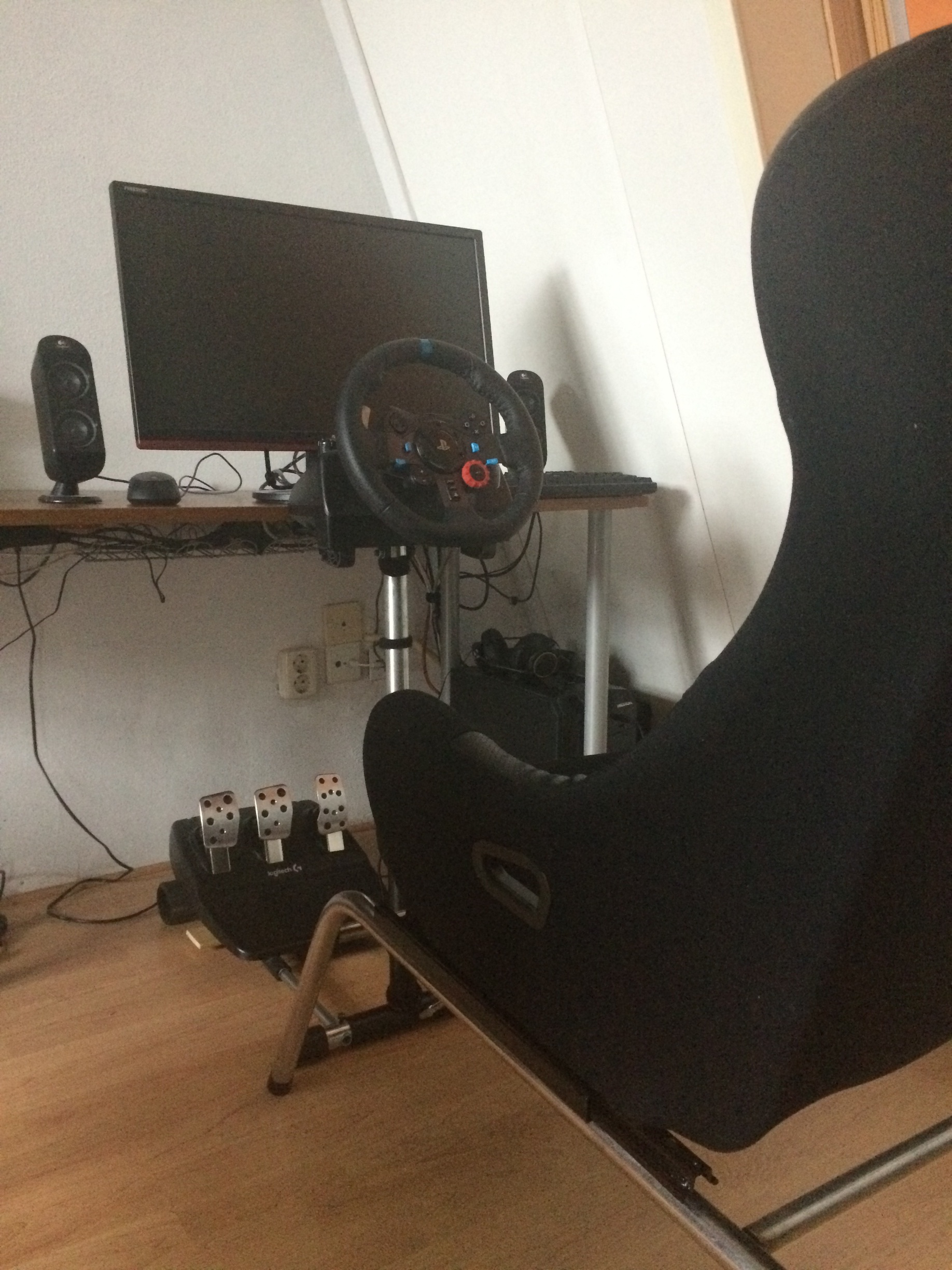 Na lange tijd rondkijken, post ik hier graag ook mijn afgewerkte racing rig! Mijn vorige stuur was een eenvoudige Logitch MOMO en ik wou graag een behoorlijke upgrade. Met een beter stuur en pedalen, was ik ook meteen op zoek naar een goede manier om ze te monteren.