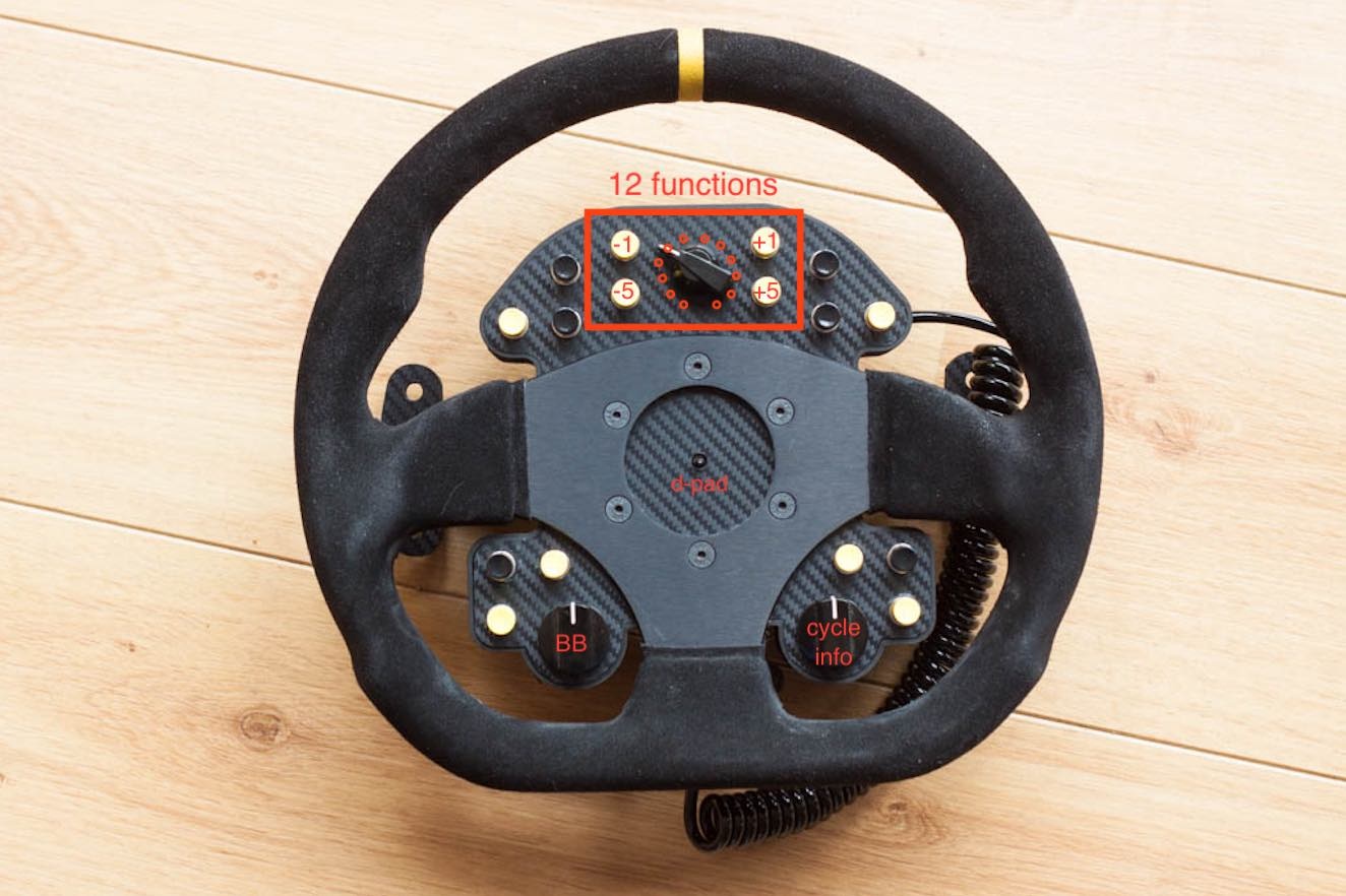 De 12 draaiknop bovenaan heeft 12 standen, zodat ik daar 12 functies kan bedienen, denk aan ABS, TC, FRB, RRB, andere settings, volume niveau van windows etc etc.