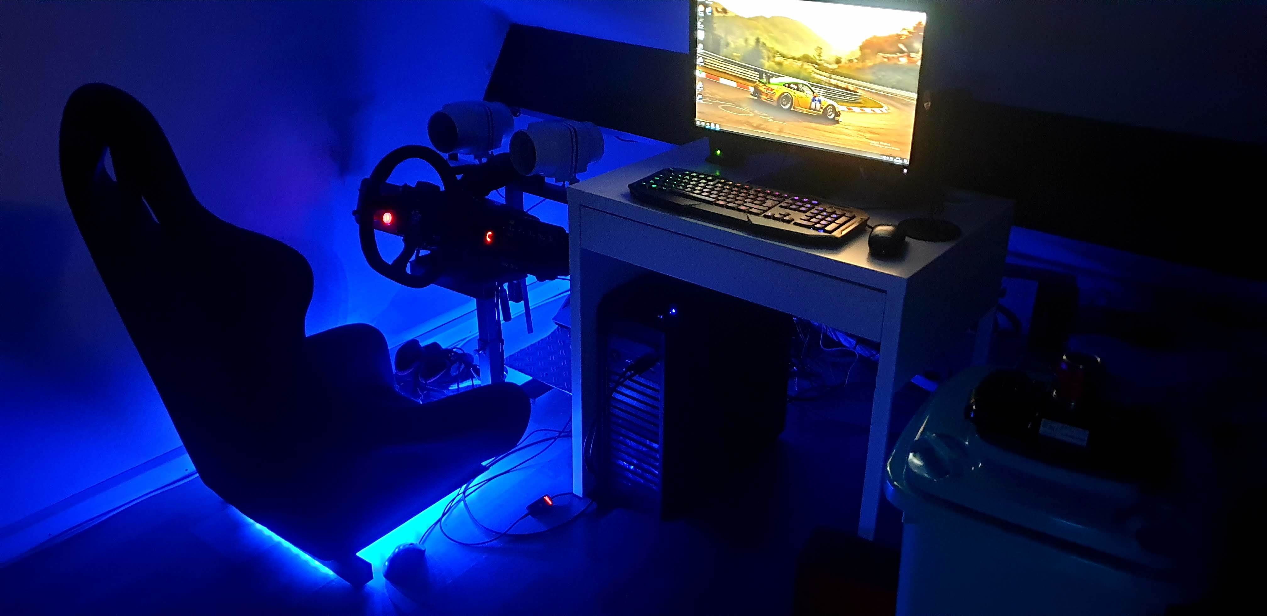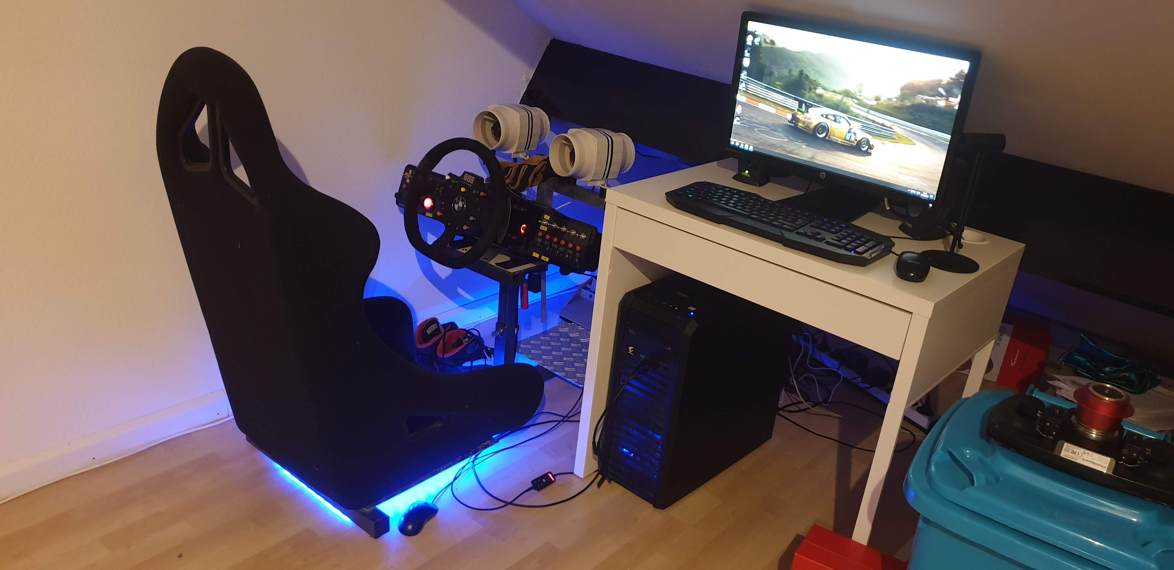 Op een eigen gebouwd frame een OMP Big stoel (had ik nog van voormalige circuitauto), windsim, Fanatec Clubsport V2 met BMW en F1 stuur en Fanatec Clubsport pedals V1.
