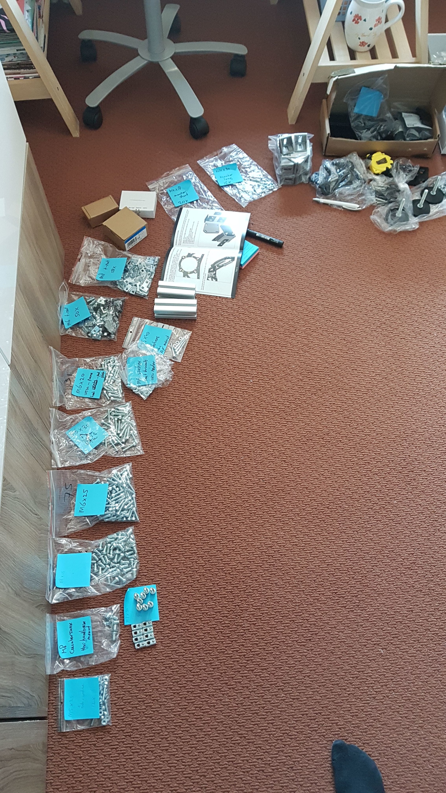Omdat alle bevestigingsmaterialen in ongemarkeerde zakjes worden geleverd en alles op elkaar lijkt, ben ik begonnen met e.e.a. uitzoeken en markeren.