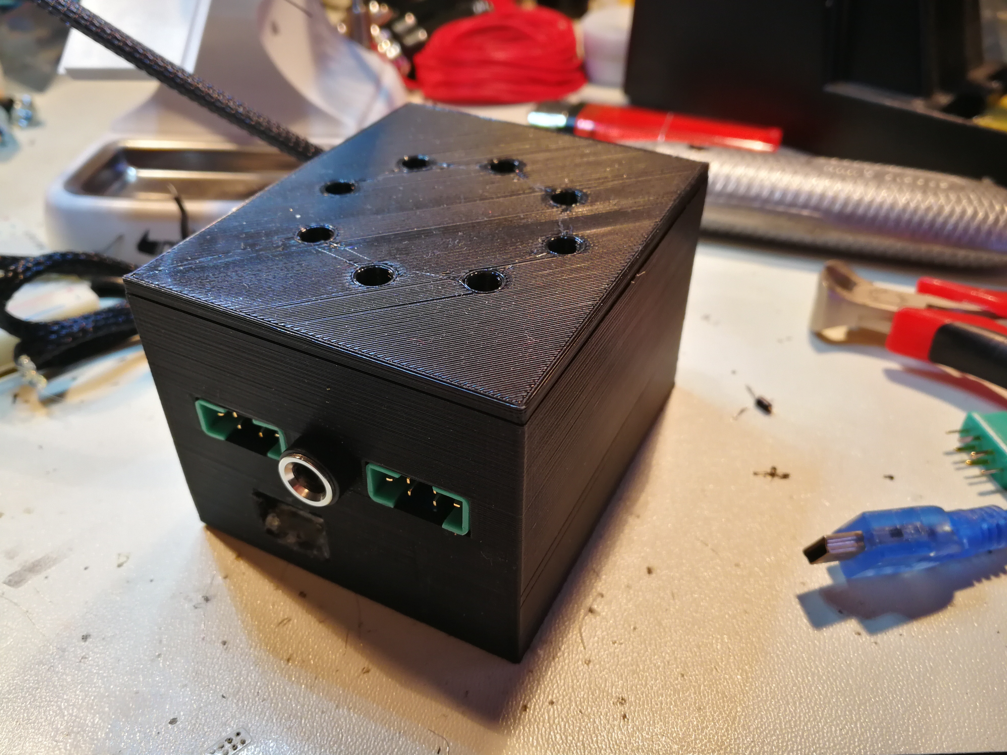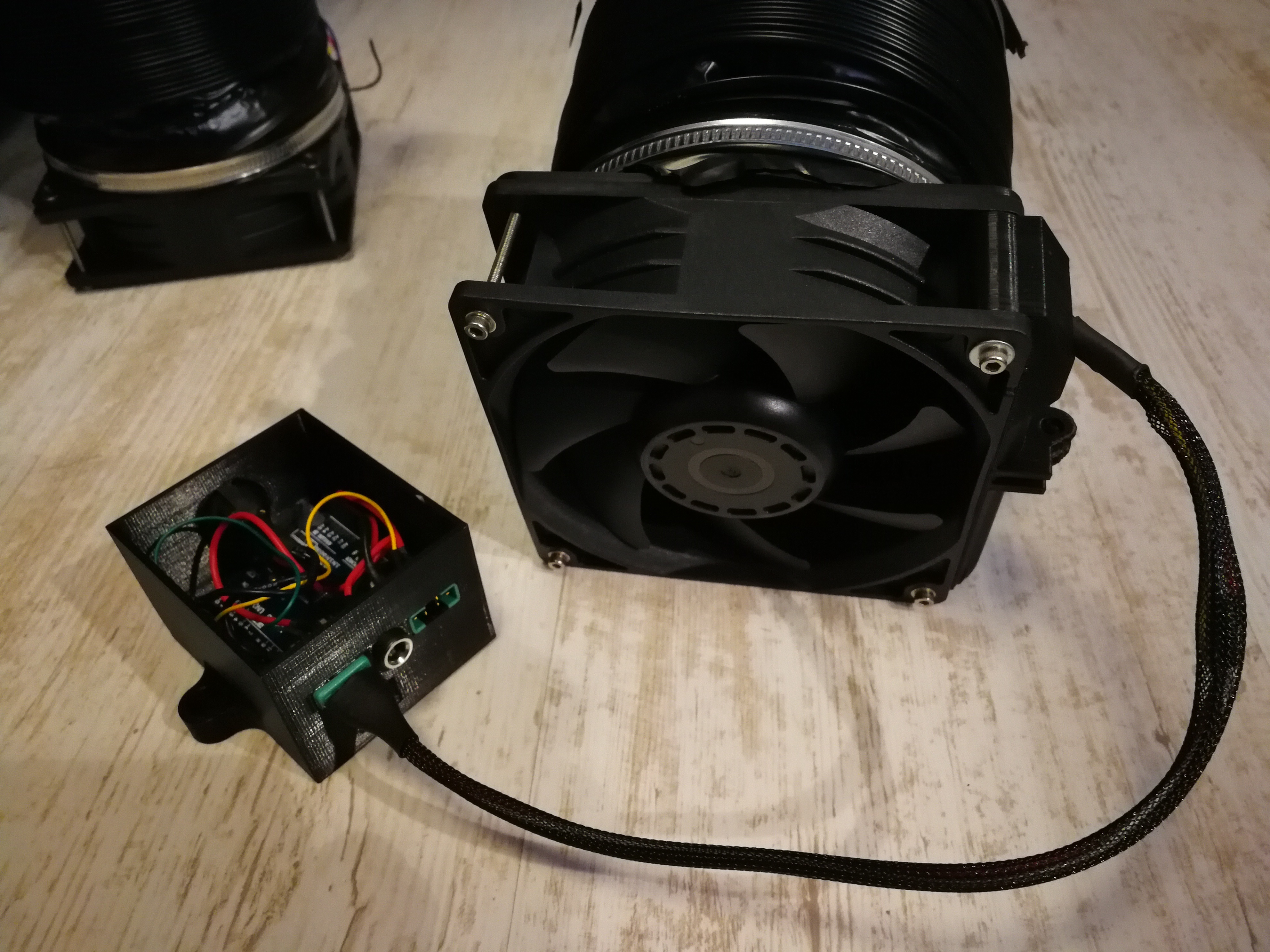 De arduino netjes in een behuizing gedaan, met USB, voeding en FAN aansluitingen