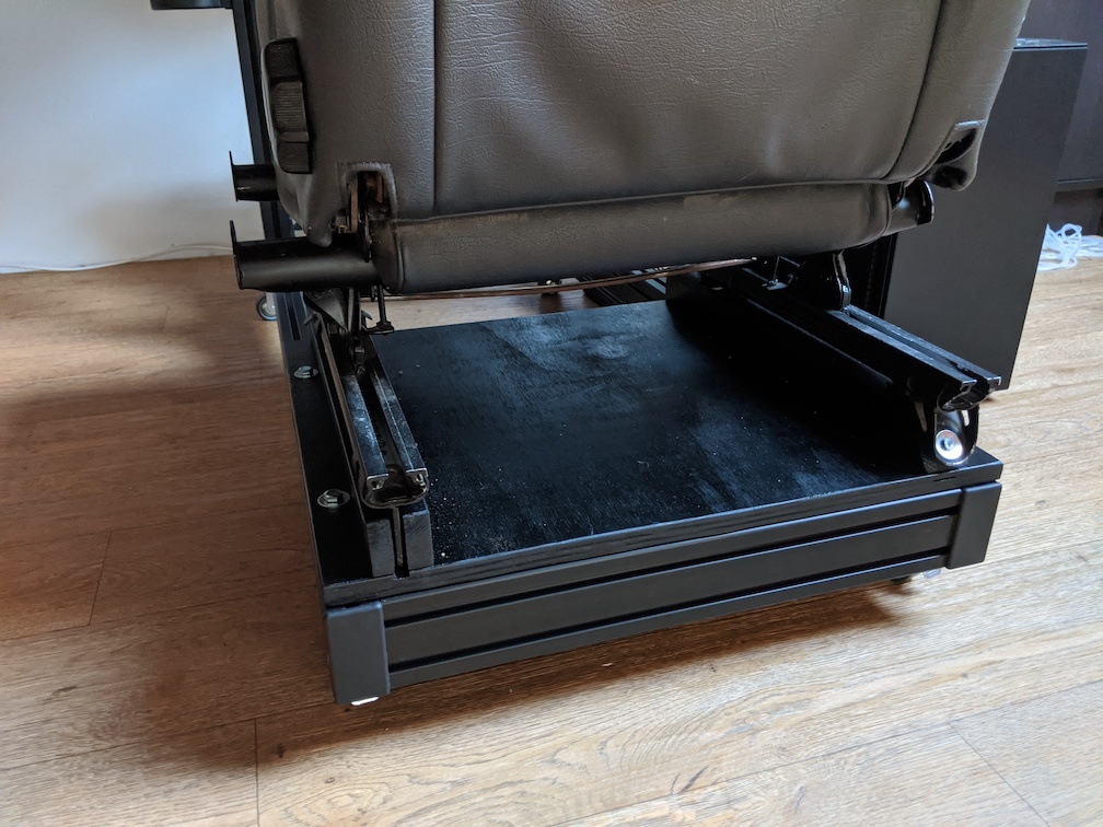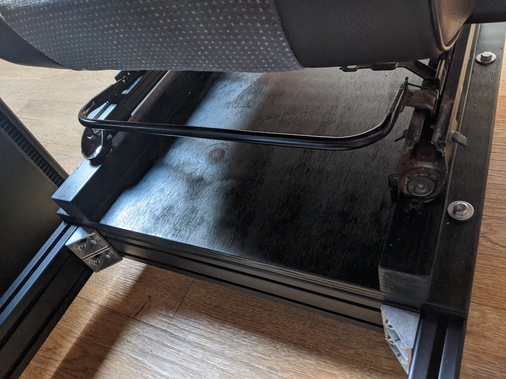 Om het budget nog enigszins binnen de perken te houden heb ik van Marktplaats een Volvo stoel gehaald (gratis afhalen). Deze stoel is gemonteerd op een 18mm multiplex plaat, met daarop 2 44x44 mm balkjes. Deze houten basis is zwart gespoten en met 4 8mm bouten aan het frame vastgezet. De stoel staat nog op de originele rails, dus hij is nog te verschuiven en in hoogte en helling te verstellen. Ideaal, omdat zo m'n zoontje ook lekker mee kan racen.